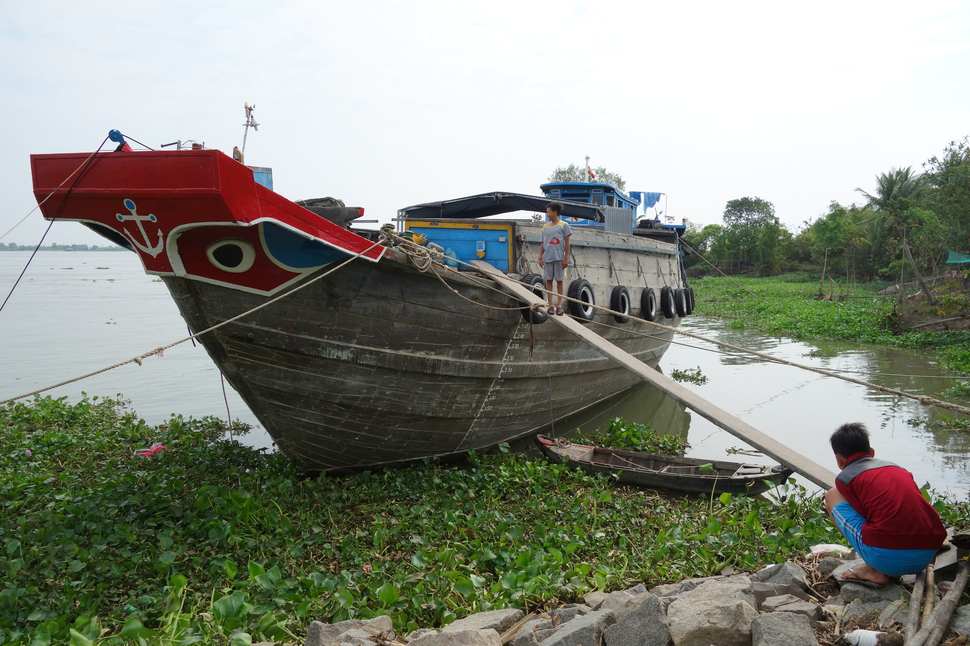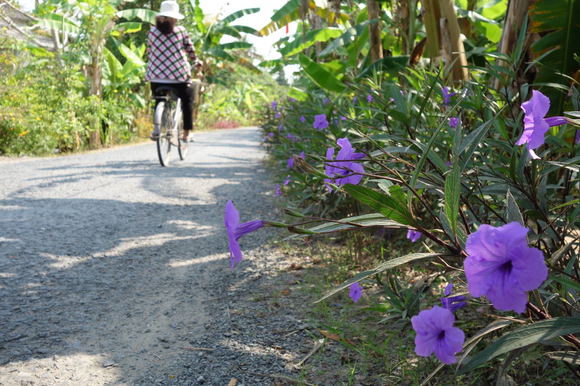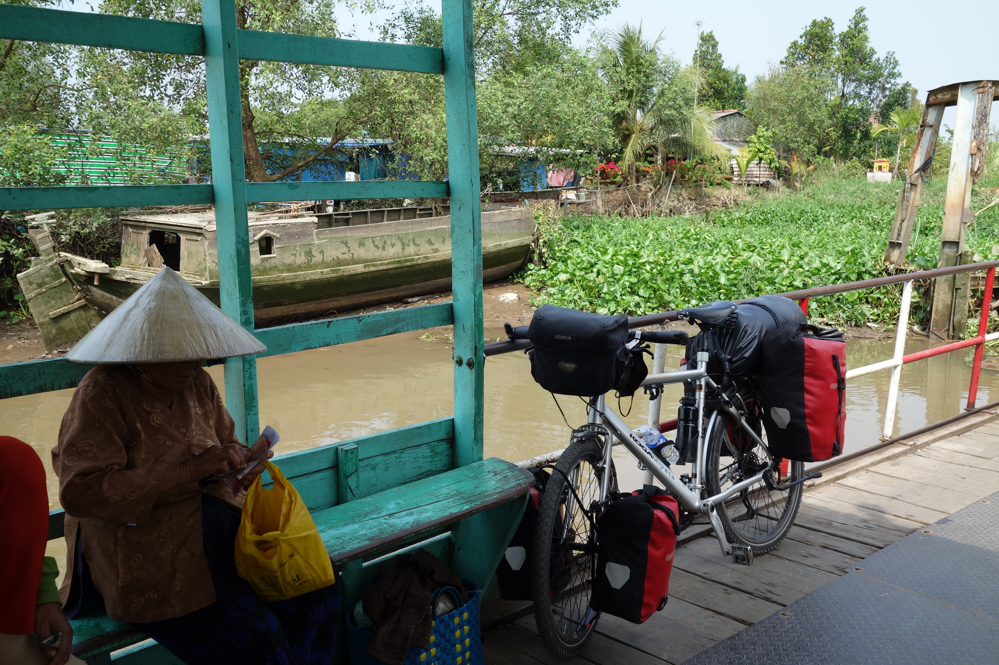 I have time to talk about those things as the ride was over long before noon. I had started off on a bumpy but most enjoyable side road along the river which unfortunately only lasted for a bit less than half of the distance. The last kilometers had to be done on the very busy Hway 80 which was acceptable though due to a wide shoulder. When I got into town I was immediately fascinated by all the colour and market activities along the Mekong. My brief consideration to carry on a bit further as it was still so early turned into the opposite when I rolled past the Lo Phuc Hotel in that orchid pitch dominated side street. I saw their balconies facing the street and when I was shown the small but very bright, well equipped (fridge, excellent wifi, locker for the valuables) rooms for 300000 dong I instantly booked myself in for two nights. What I didn´t know then was the fact that stalls in the neighbourhood sell pets and as some of the pups are kept in cages outside their whining had impact on my sleep. I would still go back to that very same hotel again!