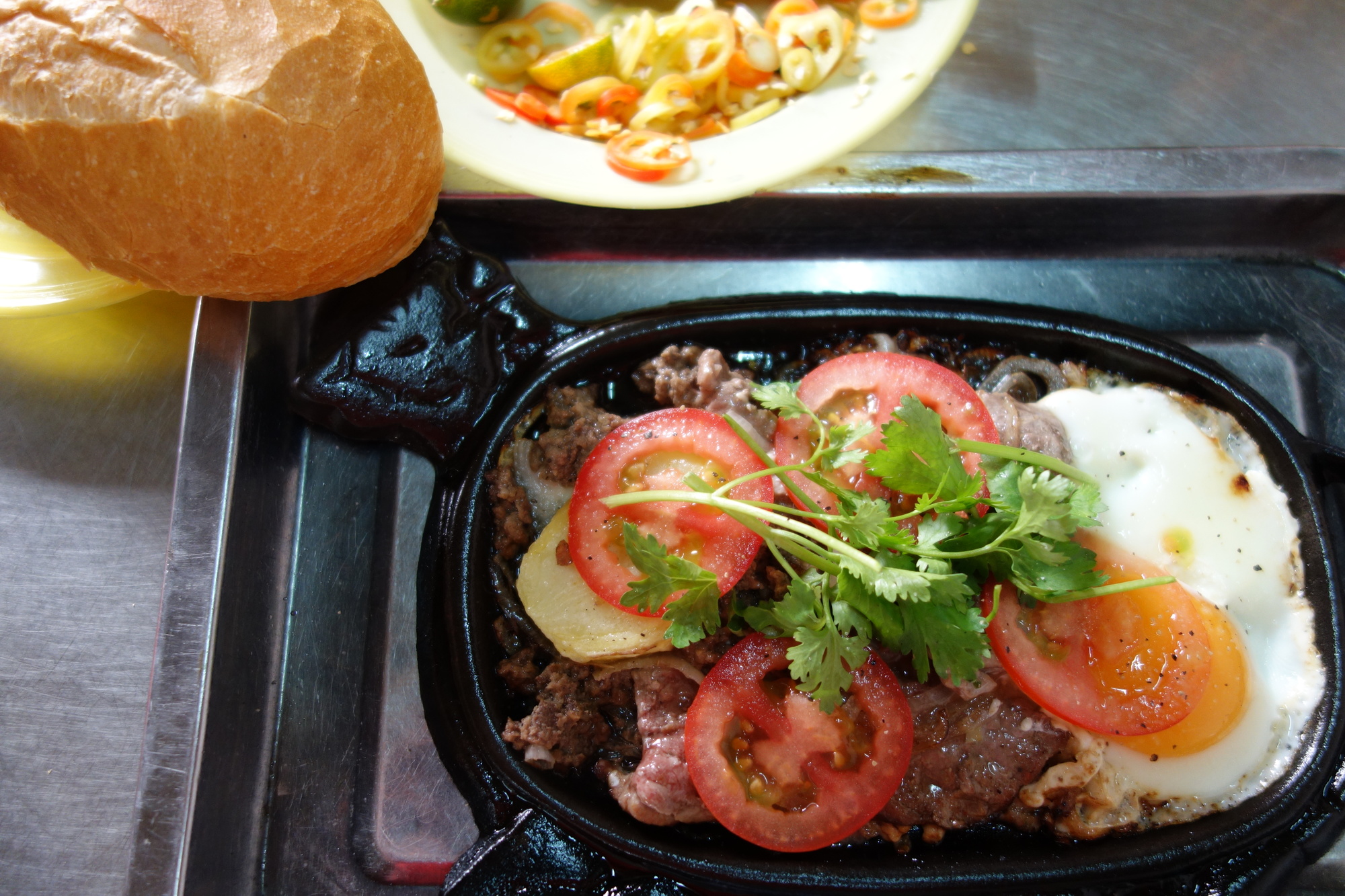 The day started with the most yummy misunderstanding possible though. Last night I walked a street parallel to the river and saw a man eating a soup in a stall. I sat down, just pointed at his bowl and said: The same please! The same was actually the best broth I ever had in my whole life. Ever! It looked different than the Pho Bo`s I had so far but the lady didn´t understand my question whether it was called any different as well. She just pointed to the labelling on her cabinet and I thought I had eaten two bowls of Bo Bit Tet and went back this morning to order it again. What did I get served? A lovely meat dish of steak, minced meat, fried egg and potato on a sizzling plate.