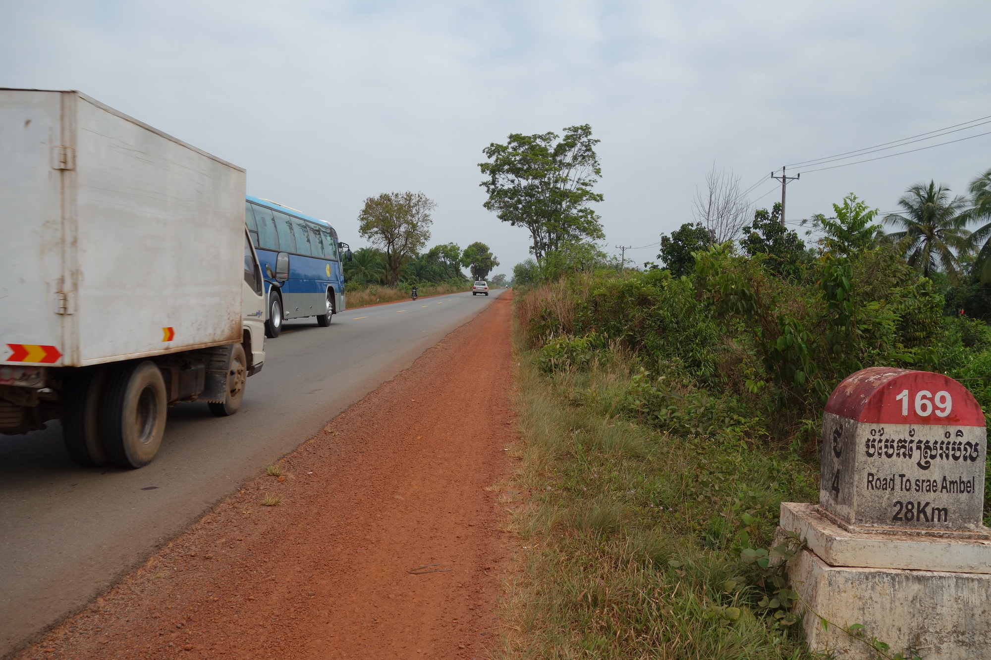 I counted every single kilometer down to the turnoff for Srae Ambel as I knew from my ride in 2012 it was going to be an entirely different world of cycling once there. Until there: the same horrible ride like going down to Sihanoukville two days ago with one important difference - the gravel on the side was a bit firmer and allowed to cycle on it. Still revolting two and a half hours and I was so immensly happy when getting to the intersection with the #48 - you wouldn´t believe it! Knowing there are another very difficult two days ahead of me but that´s up to the terrain and the heat and not about being concerned about my wellbeing.