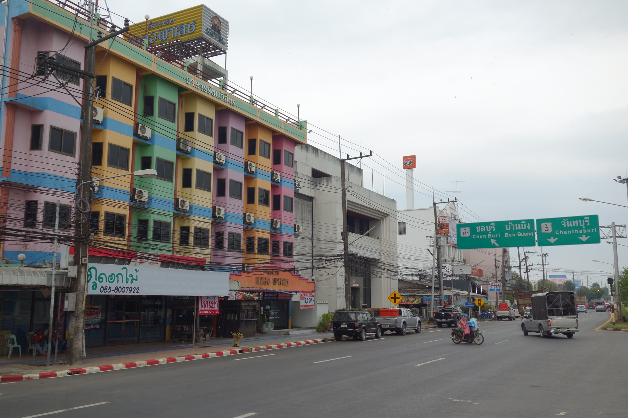 No fuss about finding a place to stay in Klaeng. I rolled down to the intersection #3/344 where I will go up towards Chonburi tomorrow. Just before the turnoff the colourful facade of the Klaeng Palace Hotel caught my attention and I am more than happy with my clean,fully equipped ac-rom for 400 Baht. And I do like Klaeng itself. South of Hway 3 you will find a lot of the old wooden shophouses along the various market squares. Attractive little town it is.