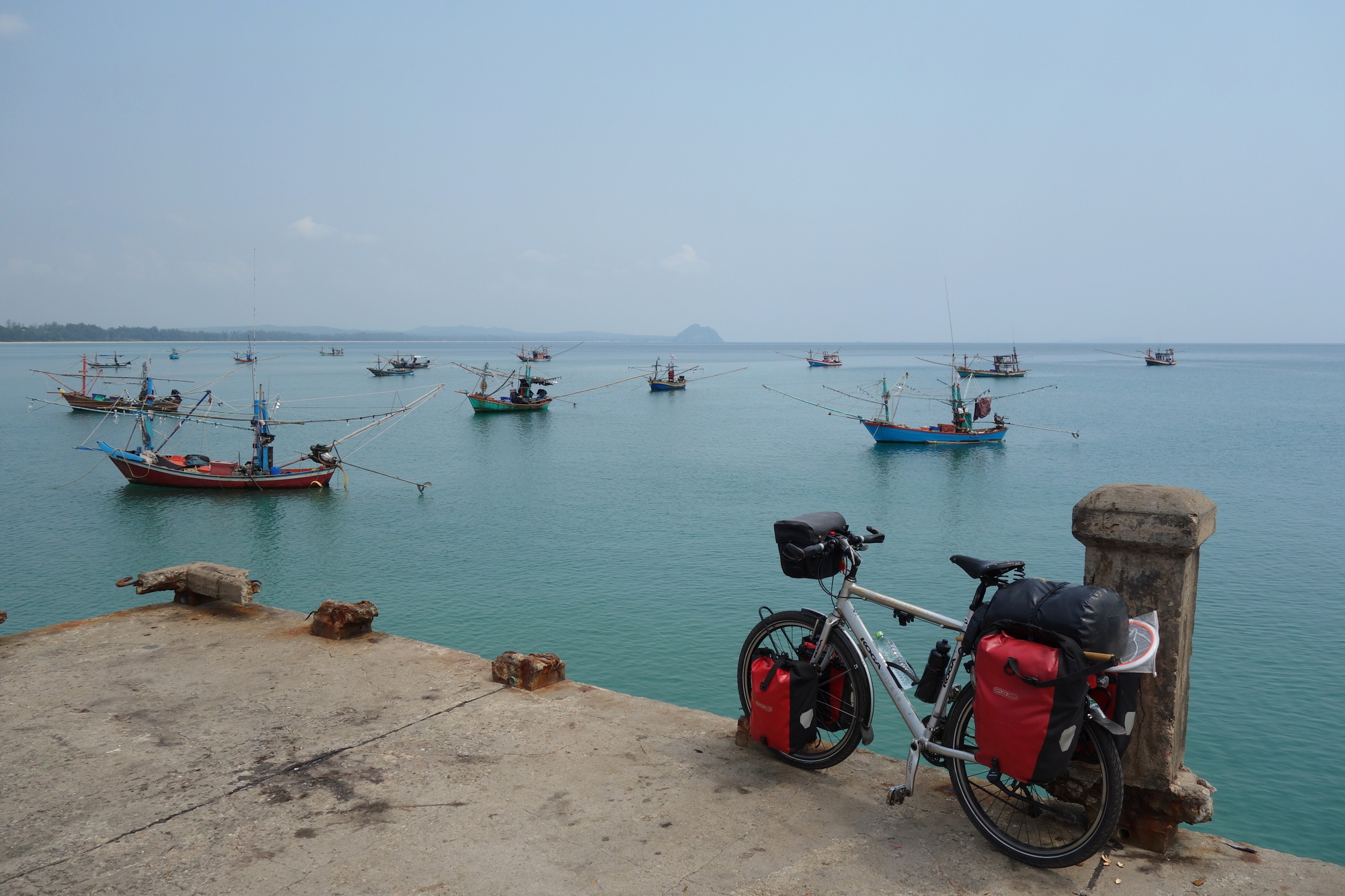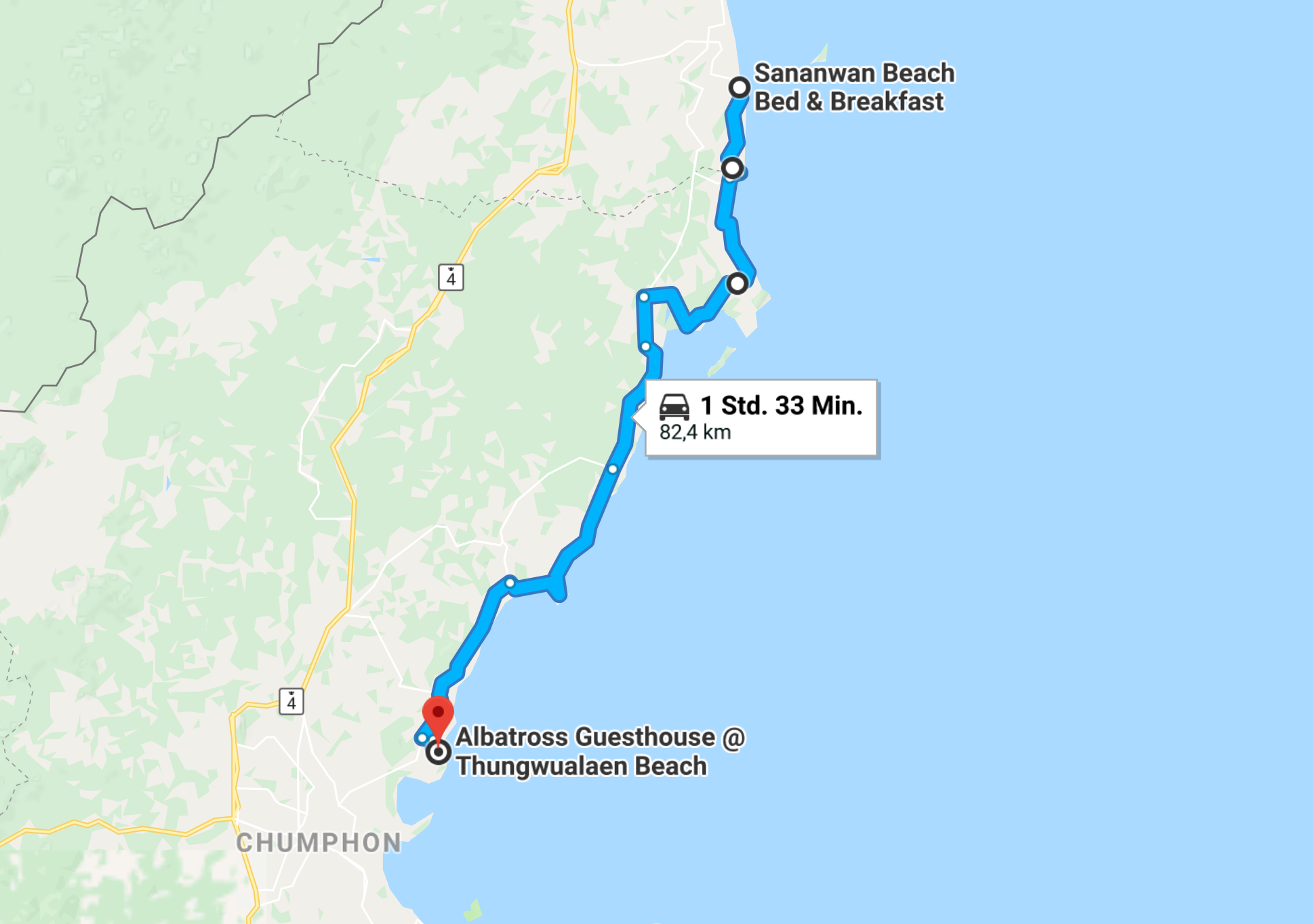 As much as I liked my two nights on Sananwan Beach, there is one considerable negative aspect: sandflies. They are a real pest, as they were up on Hat Chao Samran and in Ban Krut by the way. I tried hard (long pants and sleeves from the afternoon on; DEET spray even at daytime) but nothing helped. I have got swallen feet and ankles from the bites and the itch is just horrible. This and the persistent onshore headwind were the only complaints today. The ride itself has always been one of my very favourites, with only the section along the palm oil plantations on #3253 falling a bit behind. The rest is a fantastic run along various beaches and fishing villages. I spare you the details of the roads taken, it really is very easy navigation if you do follow the signs for Chumphon.