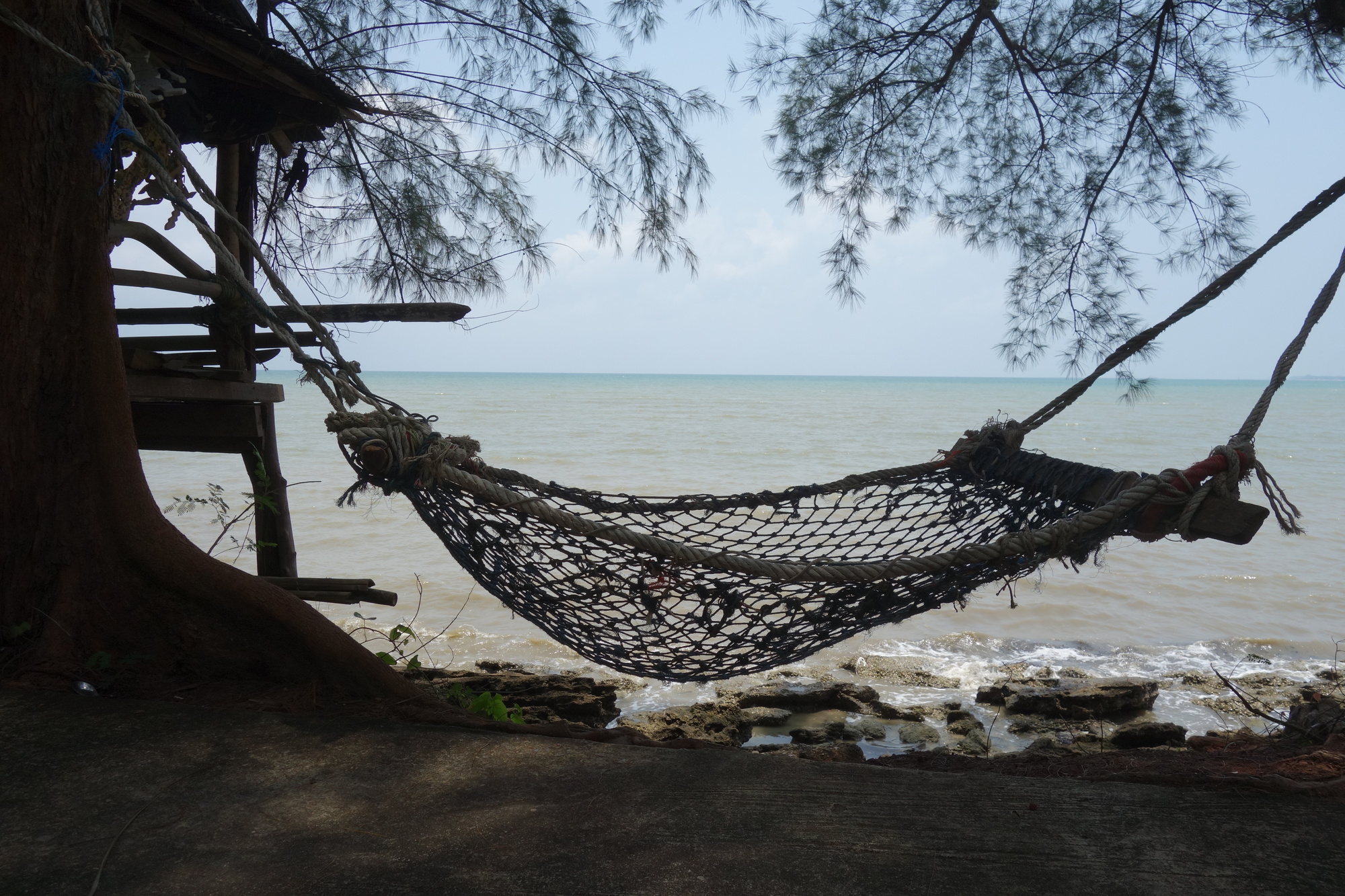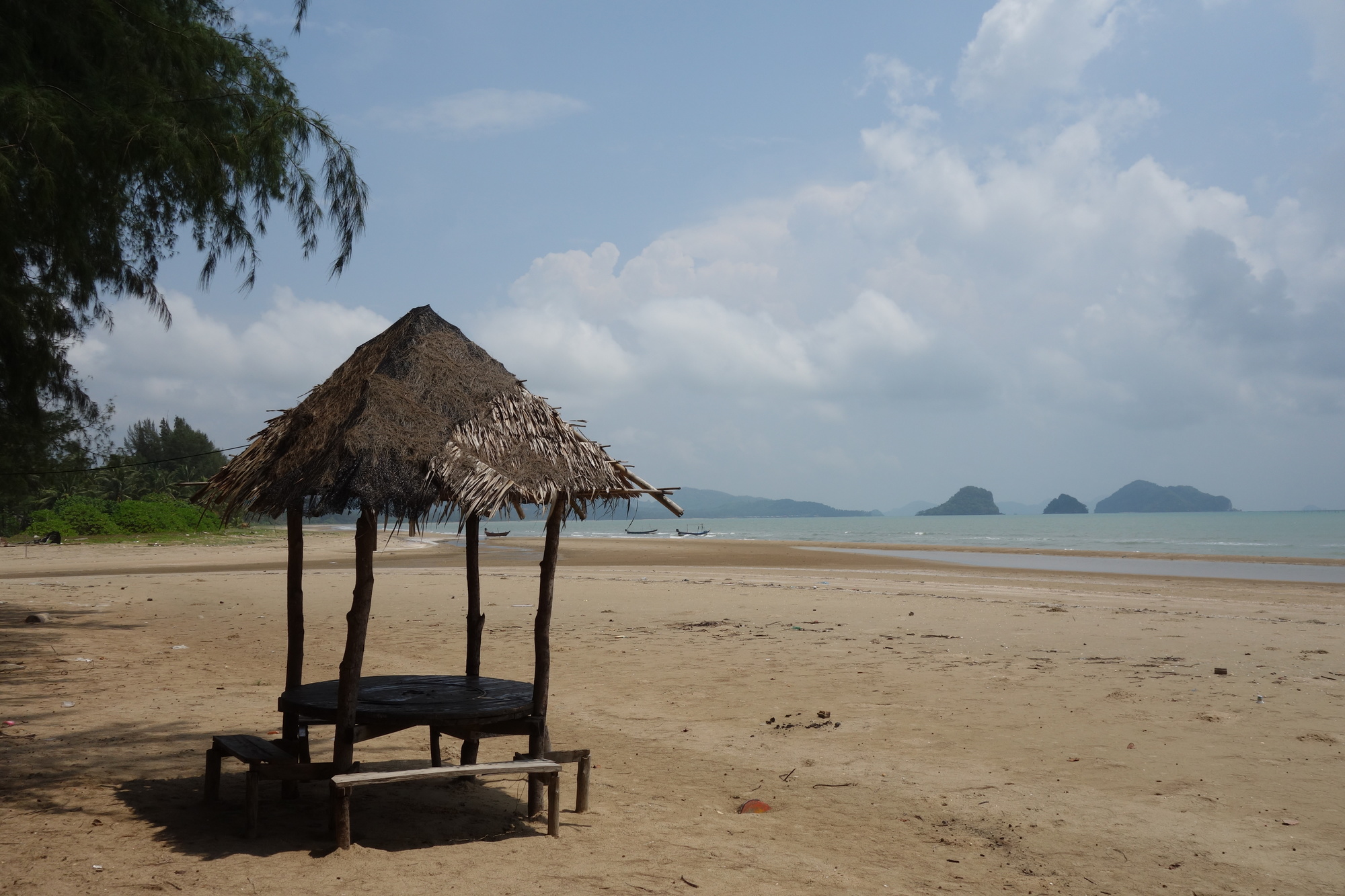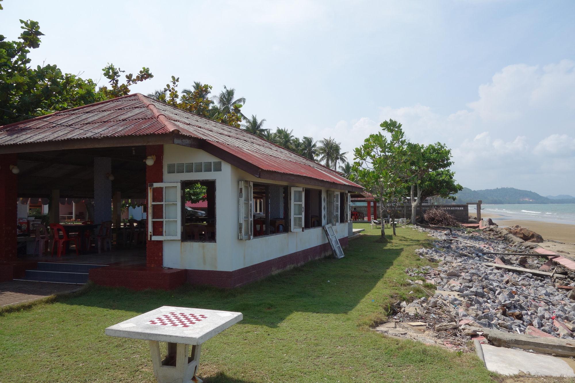 I would have loved to stay in the Thai-only-script resort that Jan has been to twice but couldn´t locate it. I had read from other cyclists who stayed in the 99 Resort just north of "town" and decided it was good enough for one night. It´s a large, slightly run-down compound with various types of accommodation, the bungalows on the southern end probably being the most attractive option at 700 / 600 Baht. Their disadvantage: they are standing sidewise to the beach and the breeze has got only limited access to their terraces. Different to room no.7 that I picked. It opens up towards the sea offering a full view as well. Quite happy with my choice, I was just a bit disappointed with the rather bland food I had. This problem was definitely solved in the late afternoon when I walked into town along the beach.