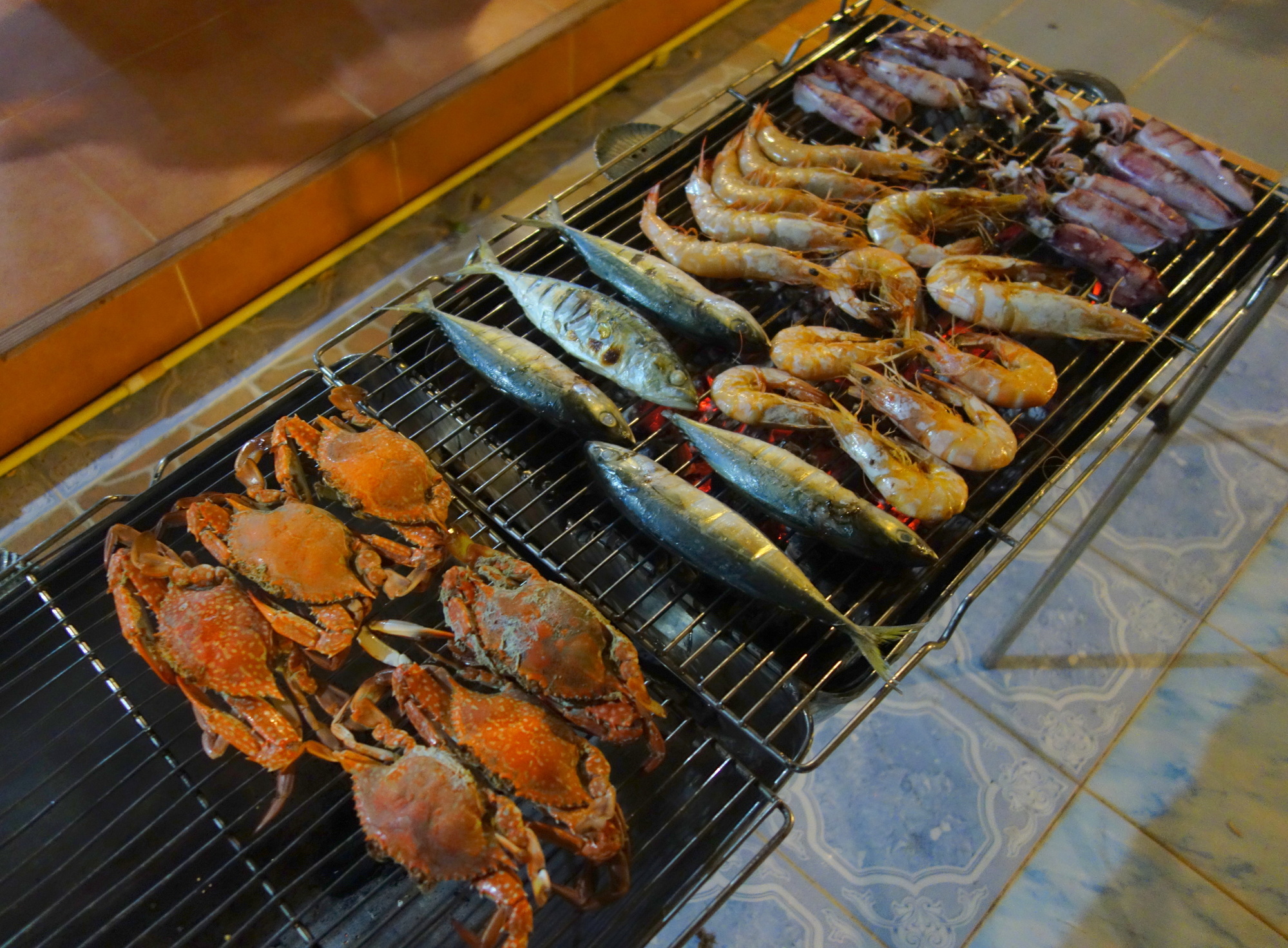 Let me finish off my time in Ban Tong Tom with a photo from last night´s BBQ. I was keen to say Thank you to Siriphan, Komar and all their family and friends who made me so welcome over the last few days and asked them to come around for dinner. What you see is about half of the stuff we got from Komar´s cousin and you would not believe the quality of the stuff, the crabs and king prawns in particular. Beforehand I was taught by Siriphan how she prepares her delightful seafood chili dip. The video has been posted on youtube: https://youtu.be/B1dcsBim6_I