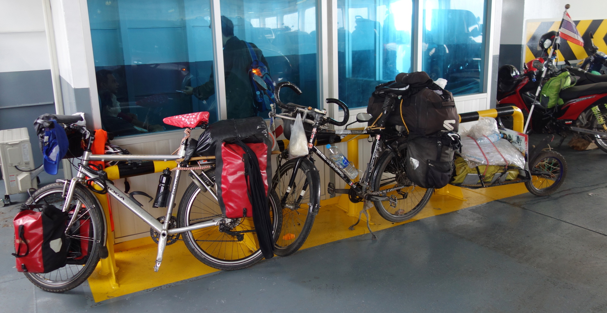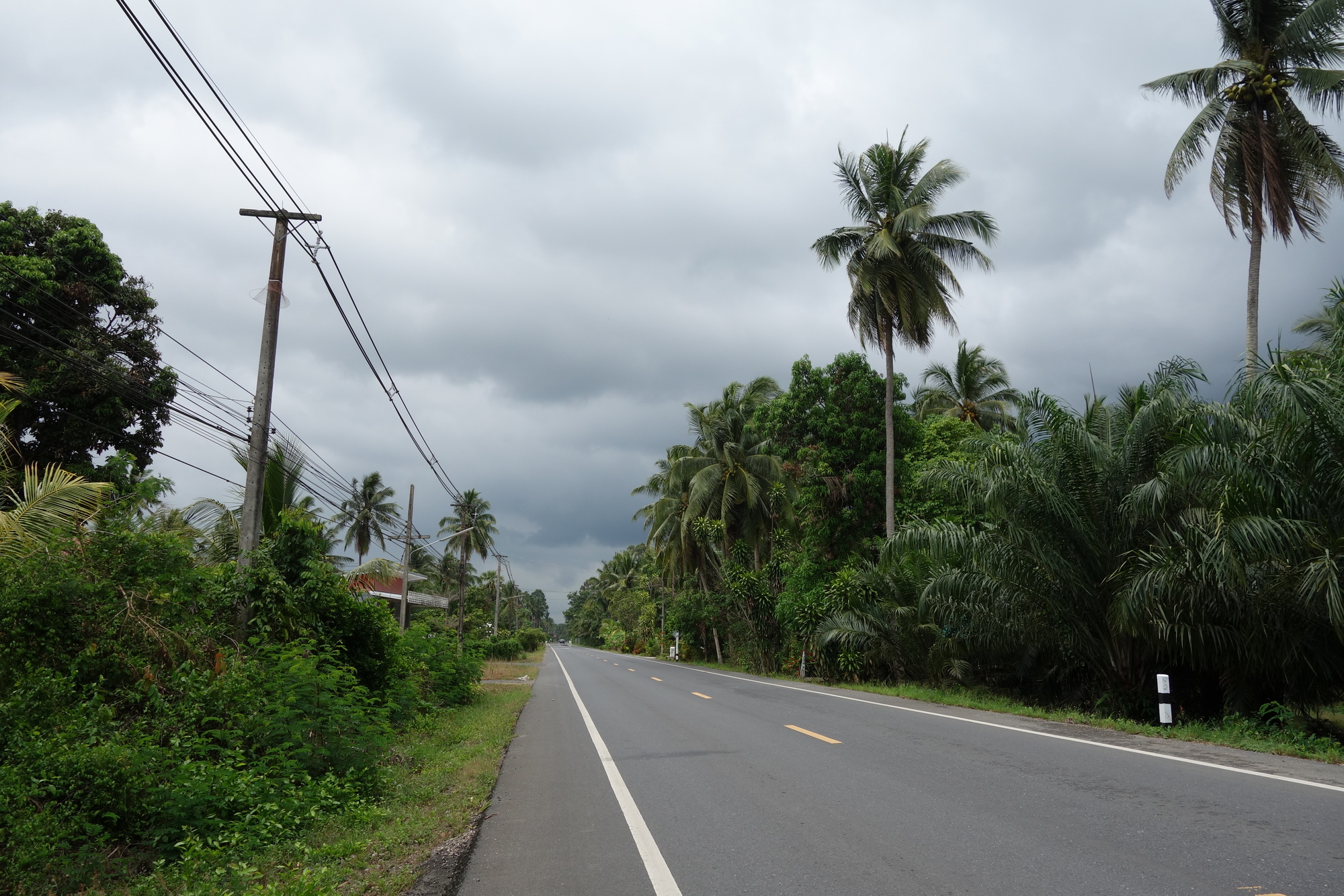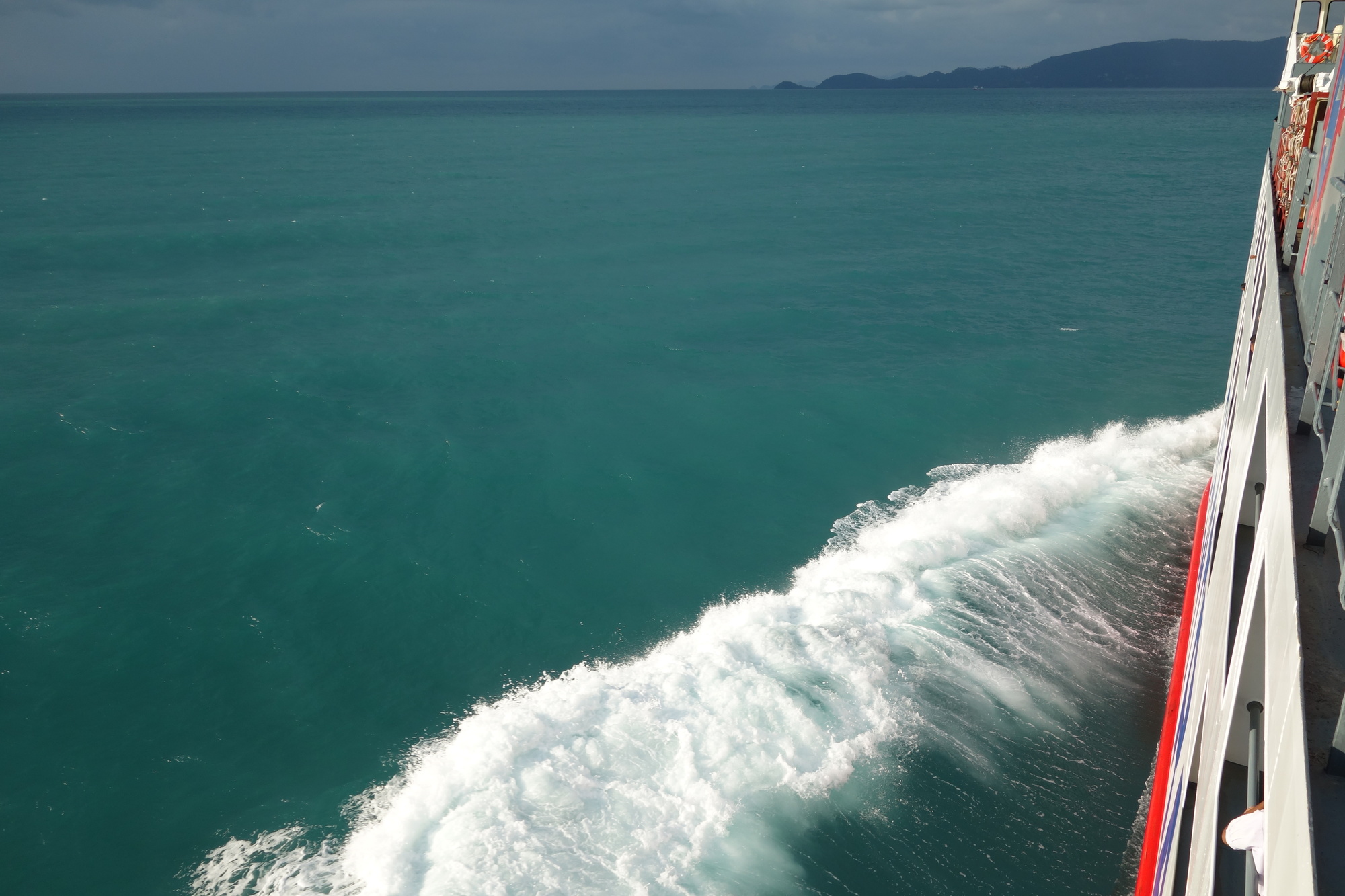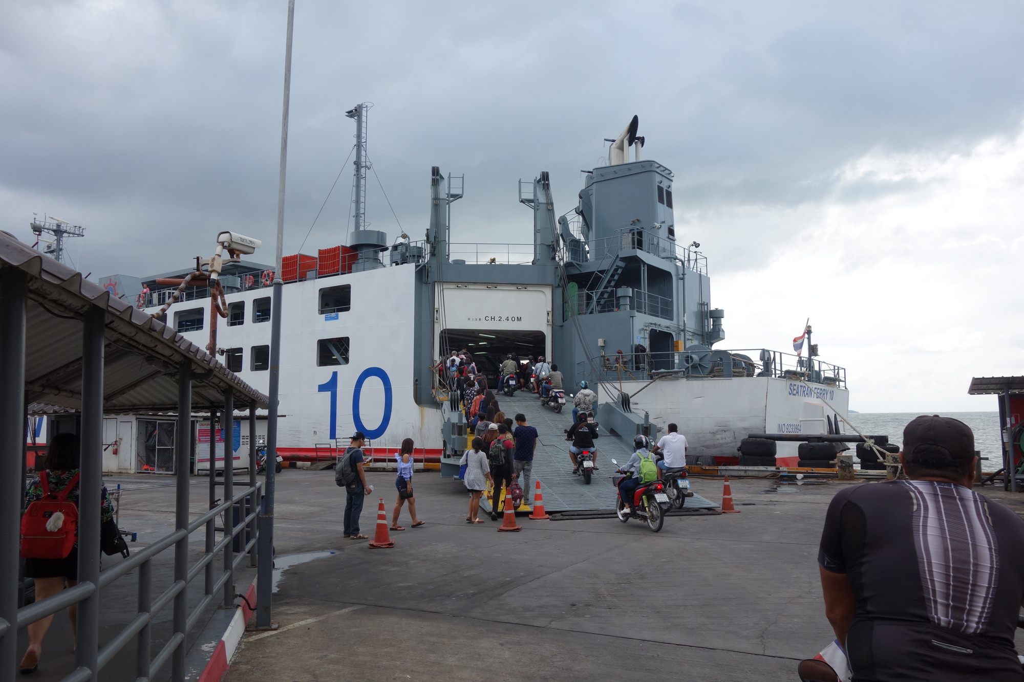 Approaching Don Sak I didn´t bother stopping anymore but in the afternoon most of the heavy rainfall had moved through anyway. It was almost 4 pm when I rolled into town and due to several rain interruptions it had taken me 7 hours to complete those 69 kilometers. Don Sak itself didn´t look very inviting in that dull weather and I decided to roll over to the Seatran ferry terminal and check out whether the sea would be as unsettled as the forecast suggested. Outside the arrival hall I asked some guys whether it was rough out there but they said it had been a rather smooth journey. So I got myself a ticket for 170 Baht (bike included), which in my opinion is inexpensive for the 90 minute crossing. Just be aware there are two ferry terminals almost next to each other: the Seatran boats will take you right into Nathon, whereas the Raja ones go to Lipa Noi pier, several kilometers south of the islands capital.