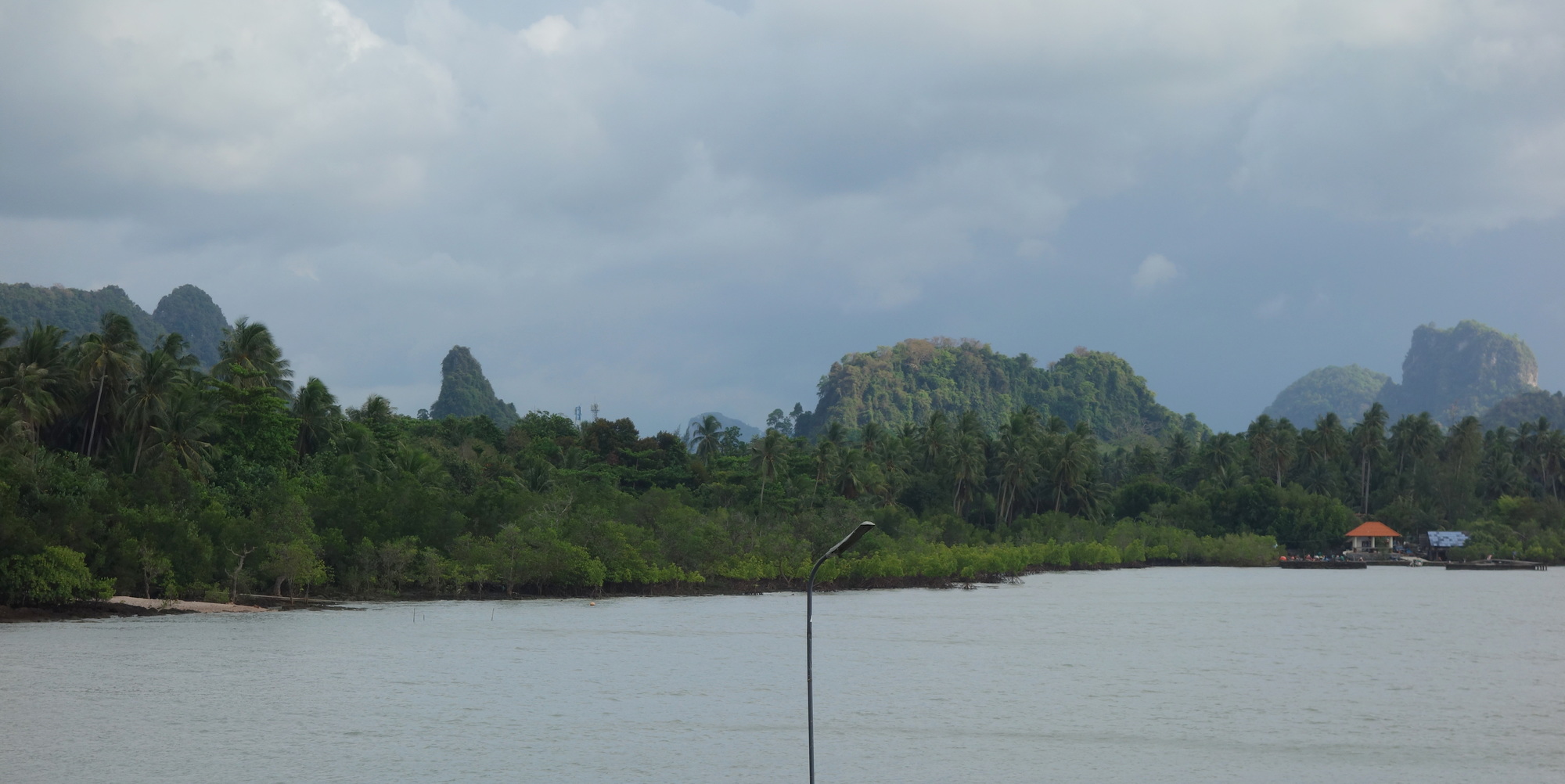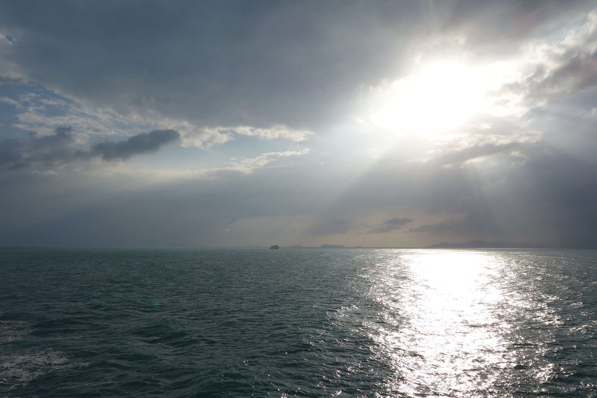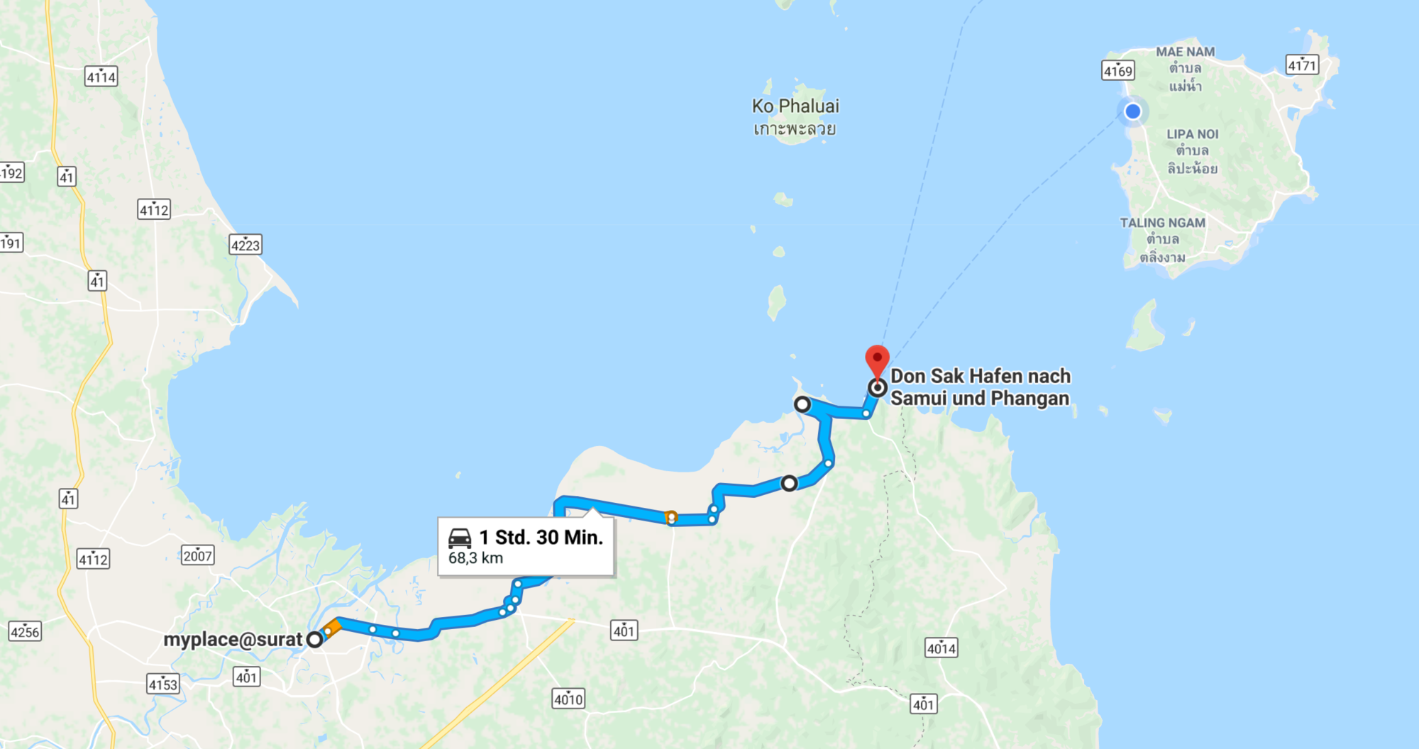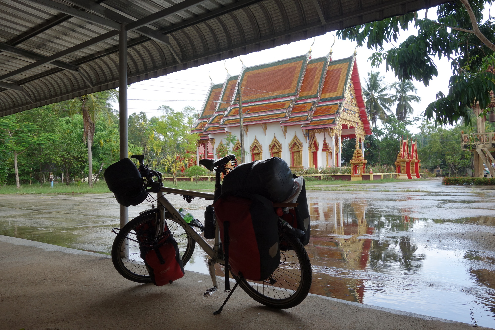 Approaching Don Sak I didn´t bother stopping anymore but in the afternoon most of the heavy rainfall had moved through anyway. It was almost 4 pm when I rolled into town and due to several rain interruptions it had taken me 7 hours to complete those 69 kilometers. Don Sak itself didn´t look very inviting in that dull weather and I decided to roll over to the Seatran ferry terminal and check out whether the sea would be as unsettled as the forecast suggested. Outside the arrival hall I asked some guys whether it was rough out there but they said it had been a rather smooth journey. So I got myself a ticket for 170 Baht (bike included), which in my opinion is inexpensive for the 90 minute crossing. Just be aware there are two ferry terminals almost next to each other: the Seatran boats will take you right into Nathon, whereas the Raja ones go to Lipa Noi pier, several kilometers south of the islands capital.