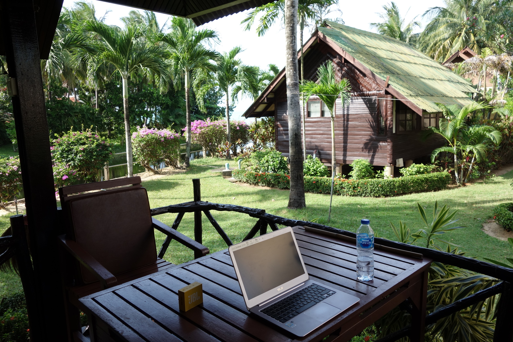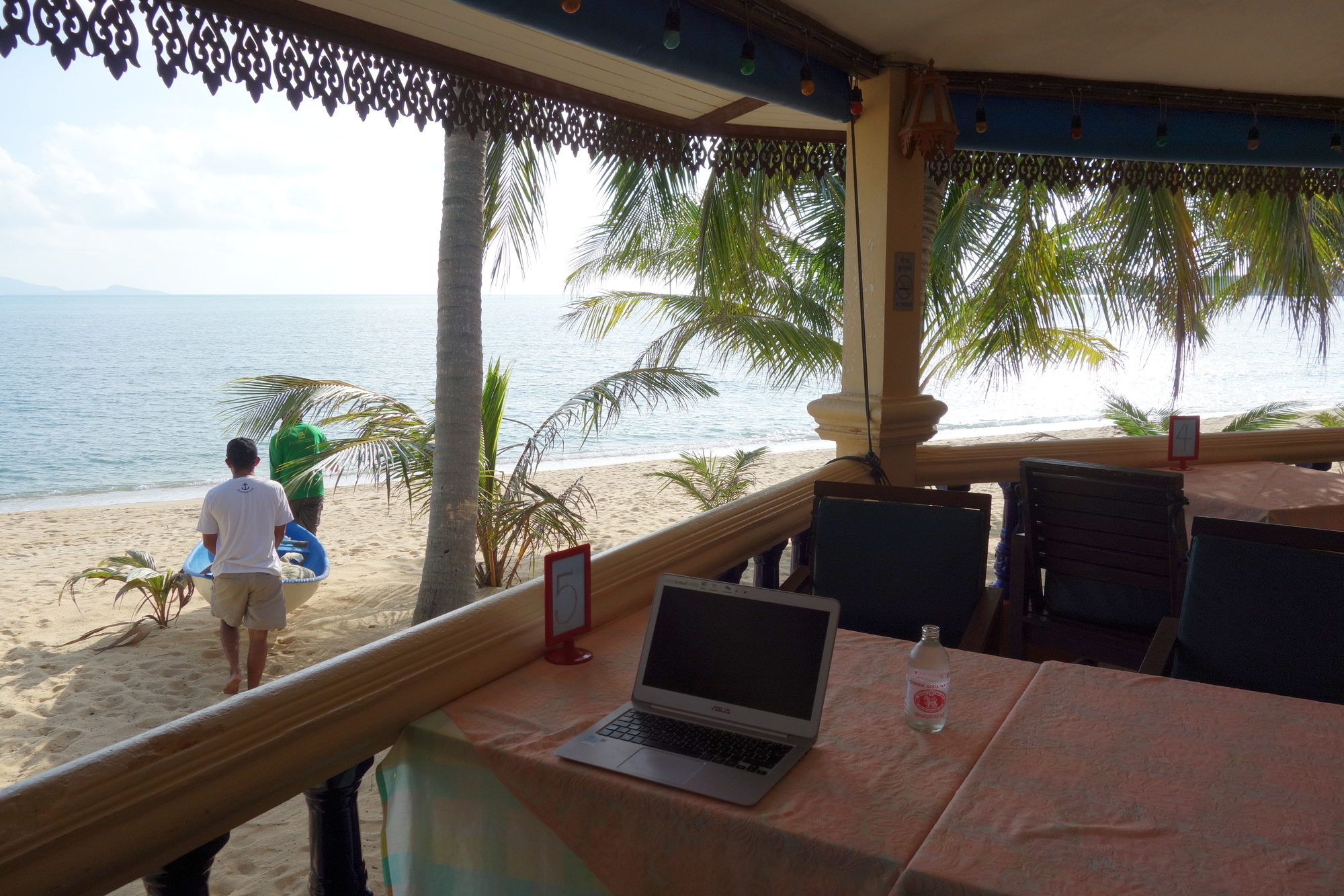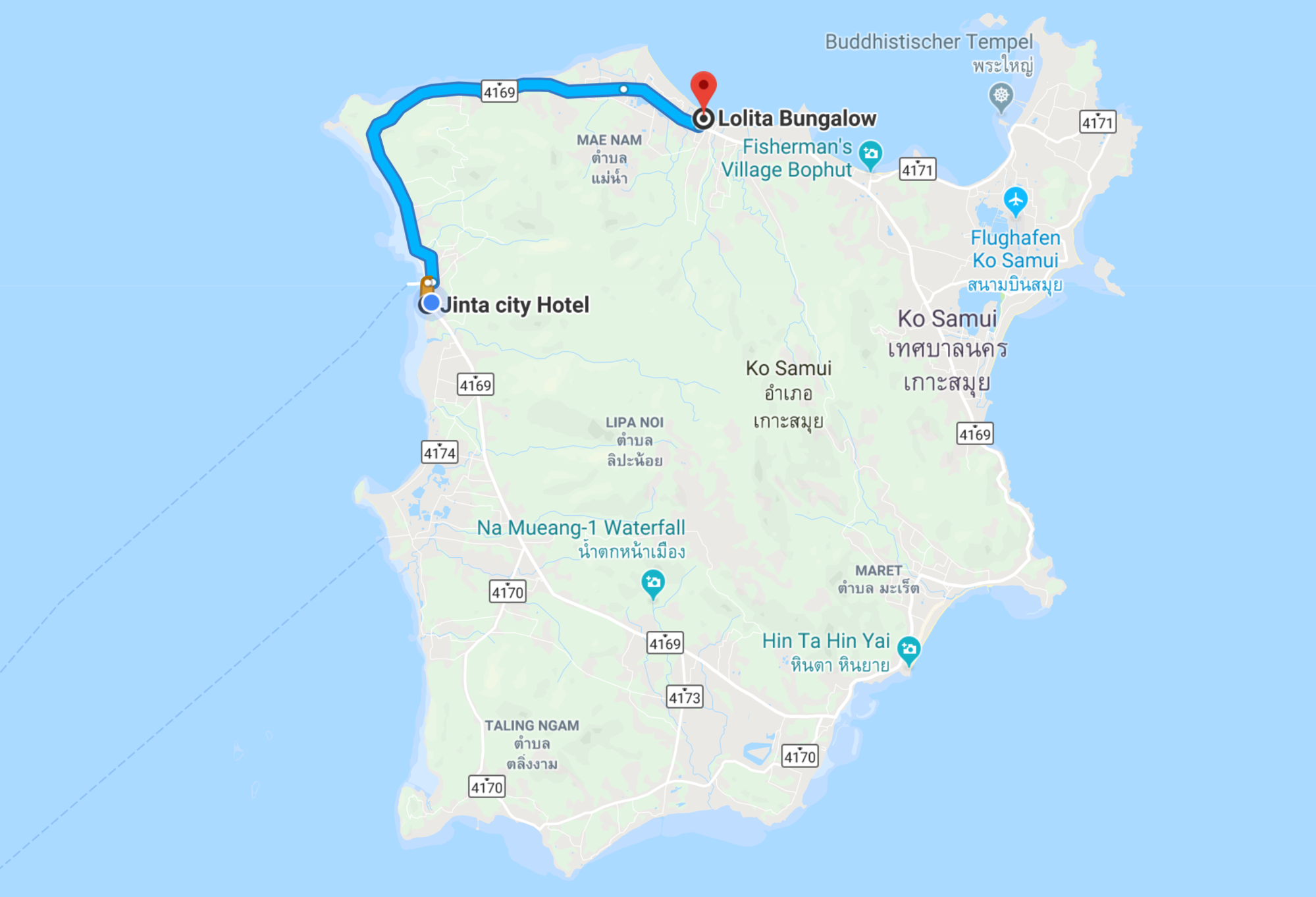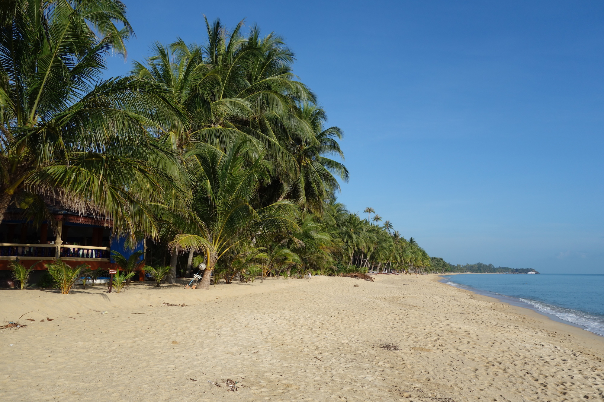 I do only post about those 14 kilometers as it is my chronological obligation. I have been coming to Maenam on the northern coast of Samui for more than 20 years now and there are two bungalow resorts I usually do stay at. The Palm Point Village with the smaller bungalows and the much larger Lolita Resort, offering the more spacious fan bungalows too. At 800 Baht per night you pay 300 Baht more too and I always decide which one to go for just before arriving on the island. This time after more than 4 months on the road I wish to have some more privacy and am staying at Lolita´s. I don´t think I will be doing much outside the resort this time as the beach is not only free of sandflies but drops rather quick and allows for proper swimming without having to walk hundreds of meters in the shallow water as in most places on the mainland. Yes, Samui is very touristy but if you are after some days on the beach Maenam is the place to be. I will actually be here for 8 nights through Songkran, meeting Andrew in Don Sak on April 17.