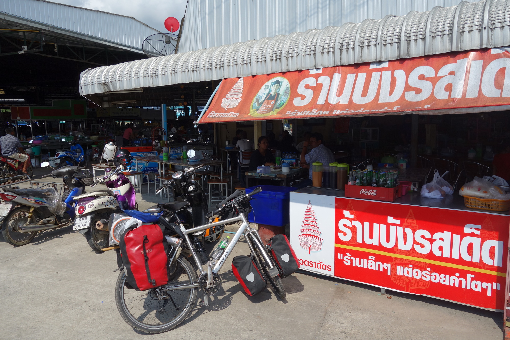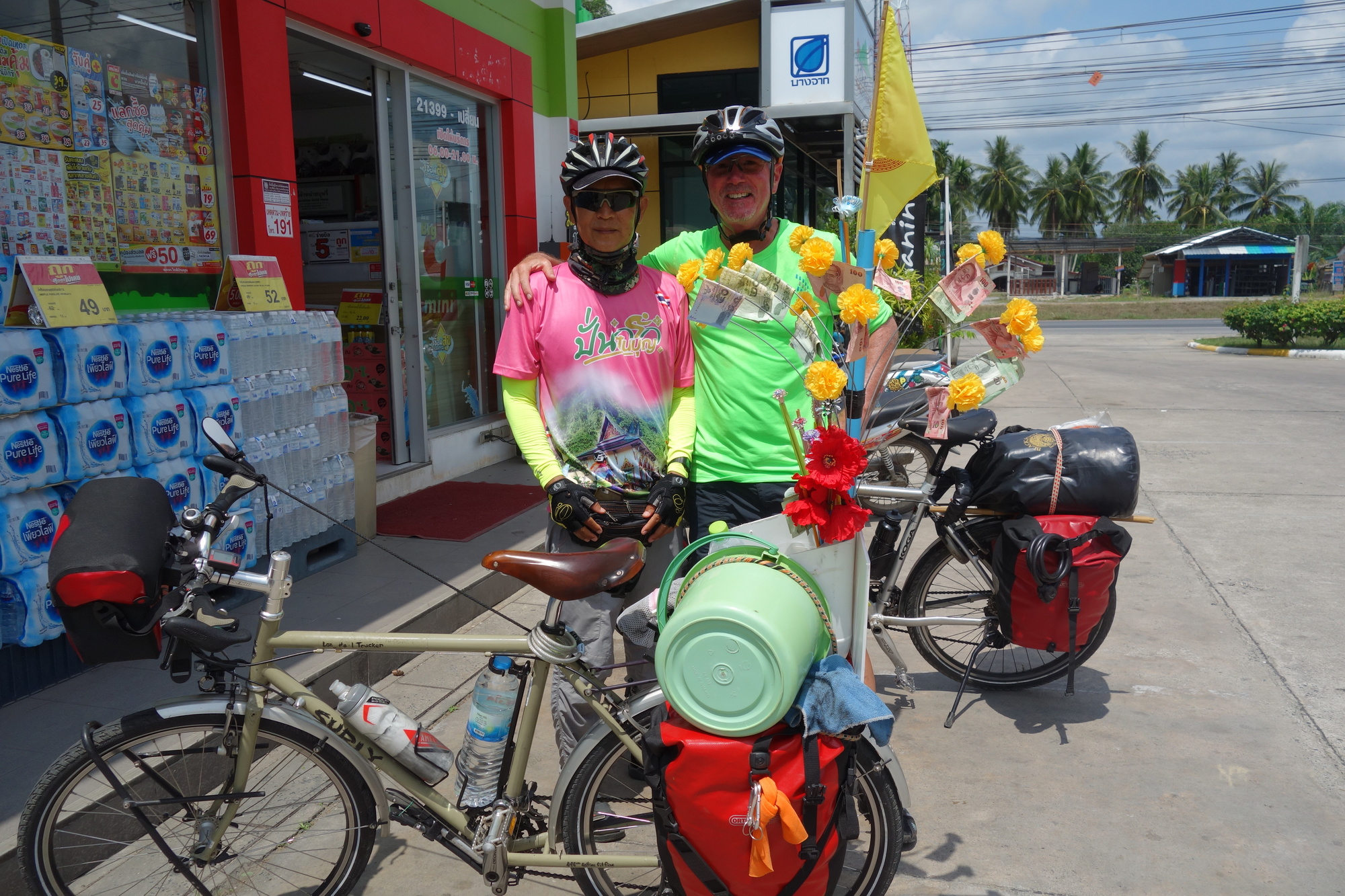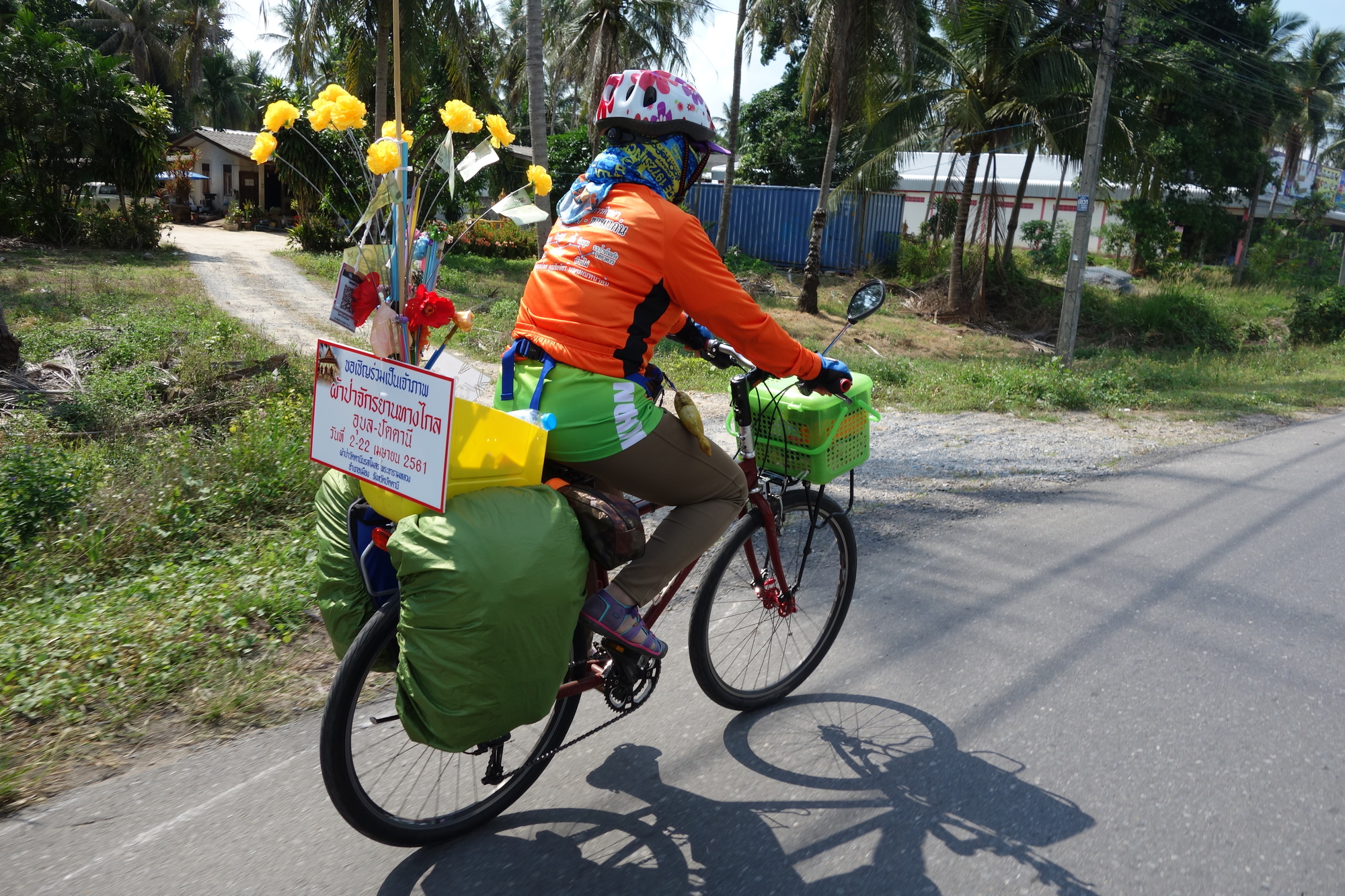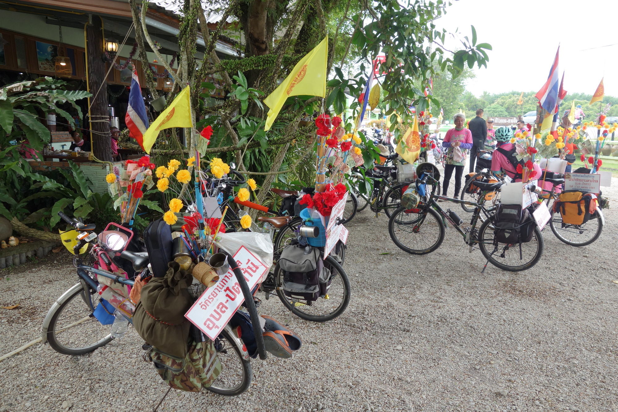 When I was sitting at the morning market opposite my hotel with a most delicious massaman curry I saw a Thai guy pushing his bike out of the market. He was obviously touring as he had a full set of panniers mounted. Plus huge flags, a big bunch of flowers and big signs in Thai script and temple photos on the rear rack. I narrow-mindedly thought: "Please don´t spot me, I just want to have a quiet breakfast." And he didn´t see me and started cycling south. Soon to be followed by several small groups of Thai cyclists with the same unusual setup. That´s when I first realized it should be some sort of either pilgrimage or charity ride.