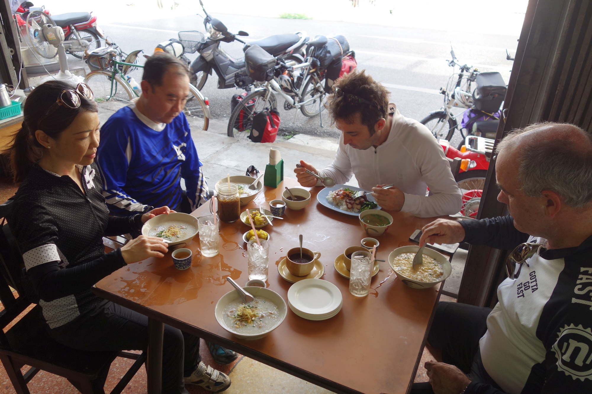 What I do entirely different when I am by myself is the number and length of stops on the way. Once I sit in the saddle it´s: Go. I really only do relax and rest when I reach my destination. I knew from the very start this morning I would learn a whole new approach. We rode back into town which is in exactly the opposite direction to where we were headed for as Chris knew a nice Thai breakfast place. The conversation with like-minded is what I enjoy most after all that time on my own. So logically that first stop lasted almost an hour instead of the 10 minutes it would normally take me to gulp down my rice porridge.