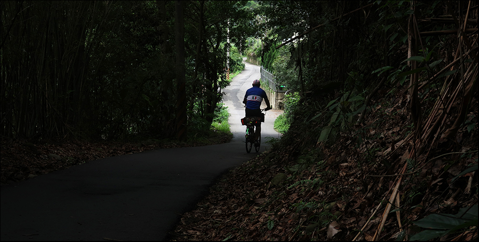 On the way back to the 4 the bamboo-lined, narrow lane looks nice and I take one more snap of myself, sticking one of the legs of the tripod into a small hole in a concrete telegraph pole. It's just as well as a 4x4 drives up as I'm cycling towards the camera and I have to brake and squeeze against the thick bamboo stalks to let it pass.