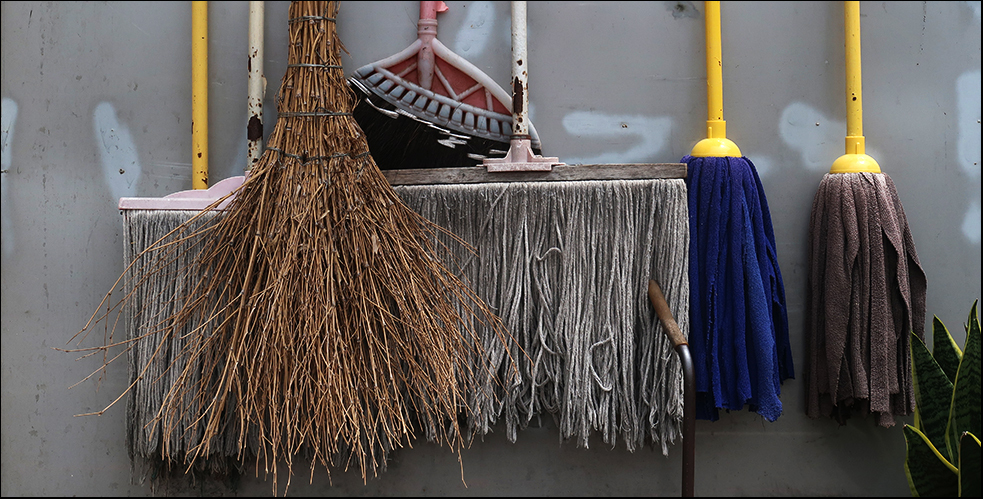 Only a block from home I stop when some mops and brushes hung on racks attached to a metal door catch my eye. The owner has quite a selection. Debbie and I only have one.