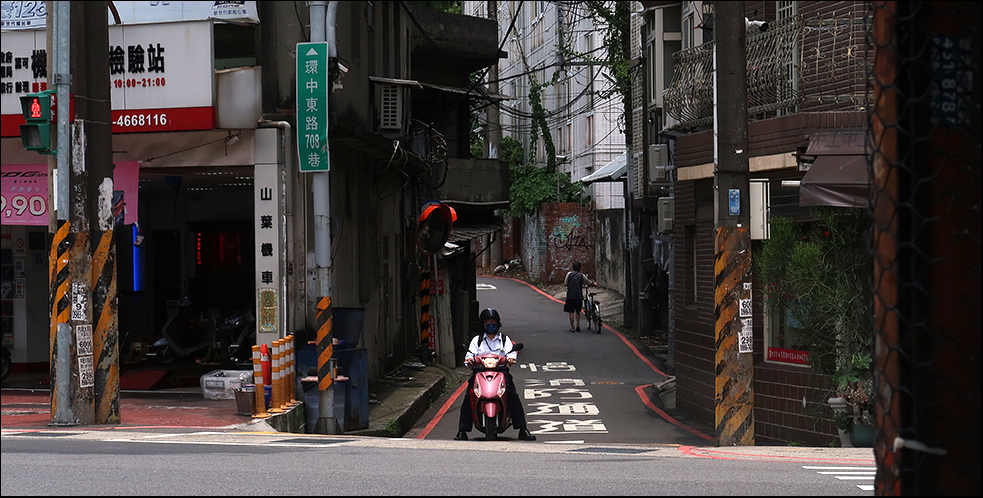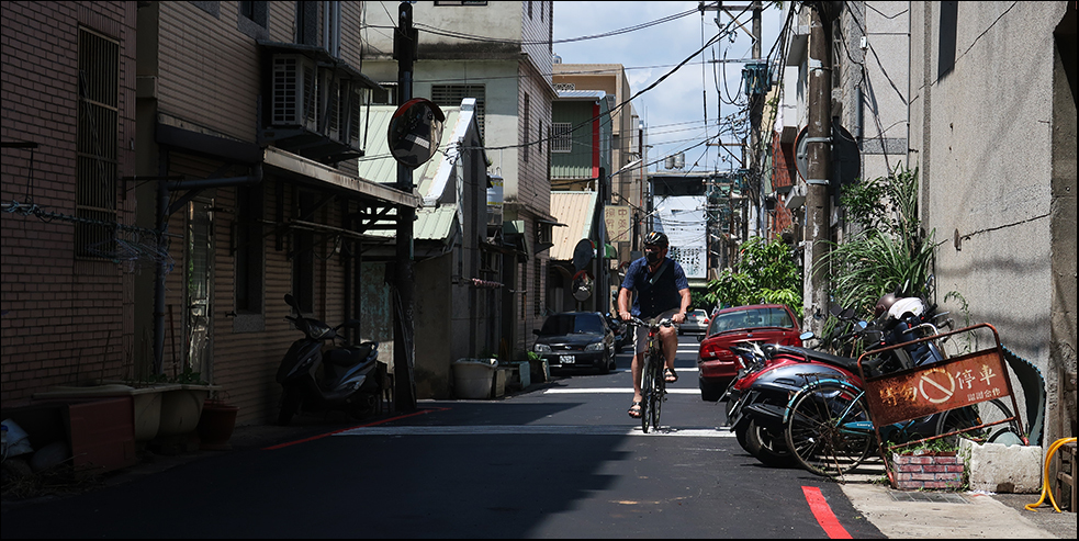 After a couple of minutes I turn off the main road leading directly into town and ride along some small side streets that are quiet. They're really alleys and are lined with four-storey town houses and apartment blocks as well as aging homes.