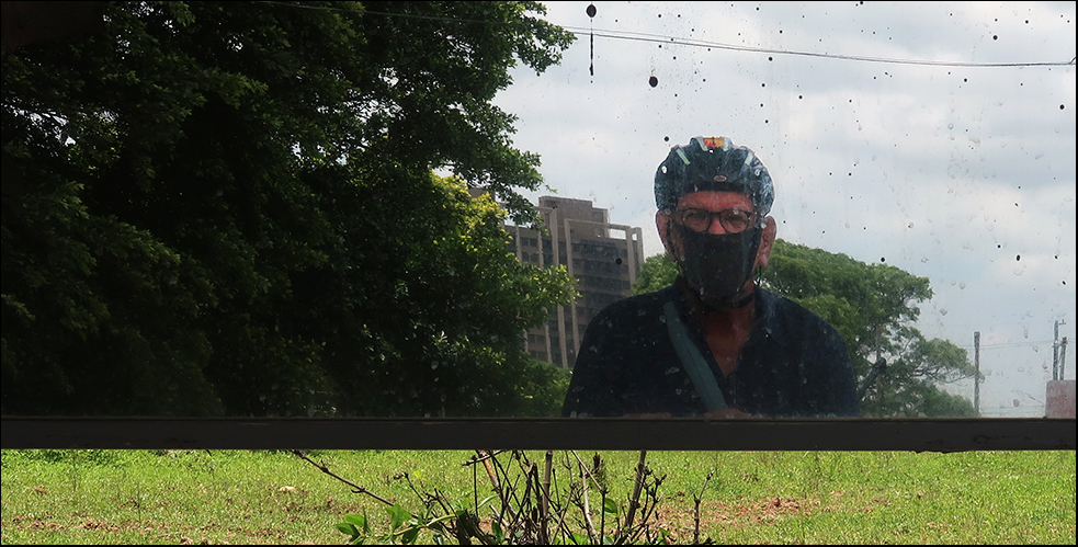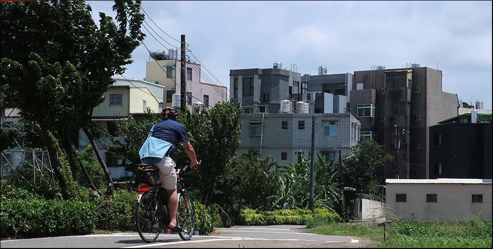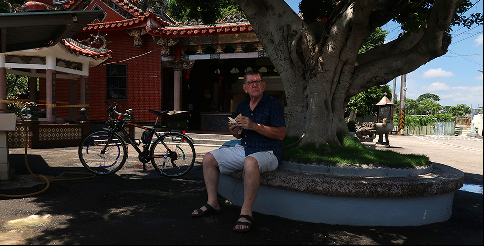 Once past a few blocks and an elementary school, there's a patch of green land that no doubt will get developed in the not-too-distant future. It's quite surprising it's survived this long and I try taking a couple of snaps of myself riding, but just end up in the shade of a tree beside a temple and notice a large mirror adjacent to a sink and settle on taking a selfie of my reflection.