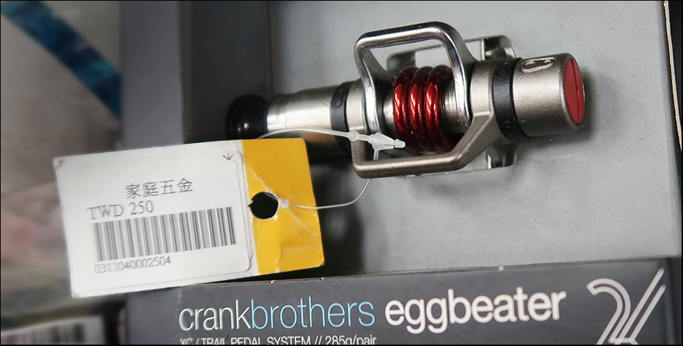 It turns out to be single pedal. Jeez! Who knows what happened to the other... my guess is a bike shop donated it after it got lost or whatever. If you were after half a pair, you'd be searching a very long time, especially for such a special type as a pricey Eggbeater. The ticket states NT$250, which is roughly US$8. It'll be here for years, guaranteed.
