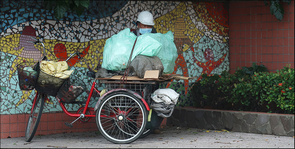 My camera is stuffed into a canvas shoulder bag along with a GorillaPod and a man in a hard hat riding a basic tricycle that's stacked with recyclables offers the first photo opportunity. He parks just up ahead of me, in the shade of a tree outside an elementary school, which saves me the task of taking a shot of a moving object.