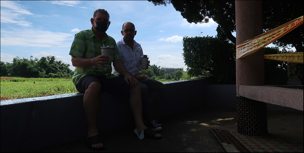 Everyone is masked up, but we obviously remove ours to have our sandwiches, cake and coffees. The men glance over. It occurs to us they think by hanging out like them at a temple that we've 'gone local'.