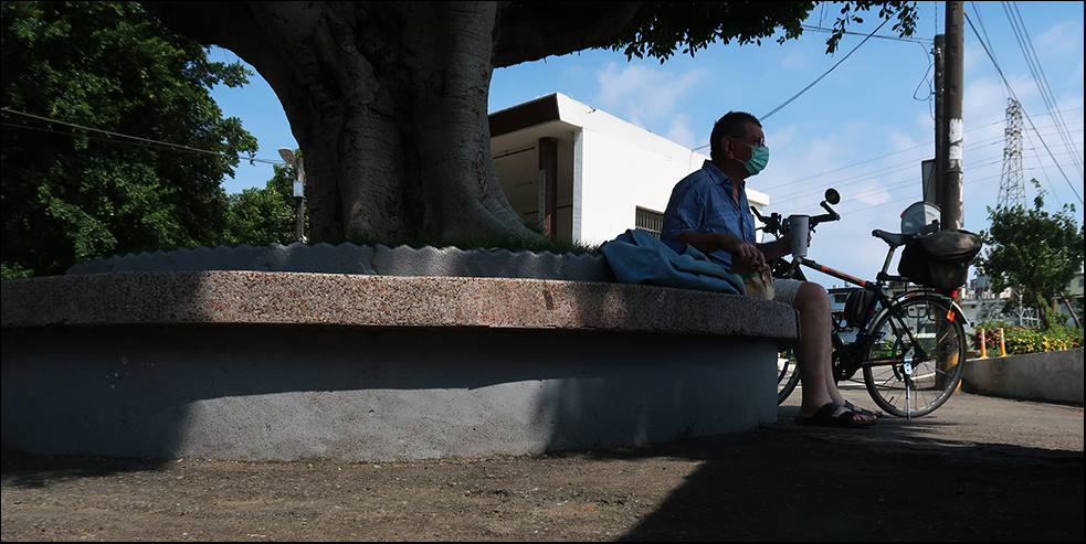 With the wind being quite strong, it feels comfortable in the shade and my view is one across a barren field, which in the past has grown rice. In the future it'll likely get developed, with yet more tall apartment blocks being built. That'll just increase the urban heat.