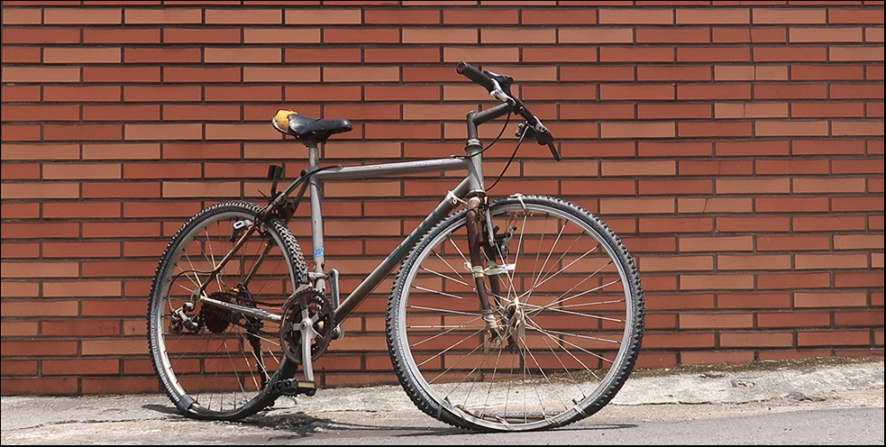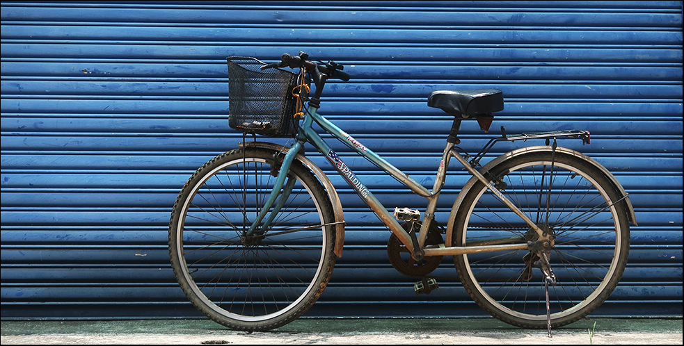 I veer down the side streets and soon see a couple of simple bikes parked outside people's homes. The first is something of a wreck, with flat tyres, a disintegrating seat and rusting parts. The front wheel is disconnected from the forks and who knows how long it's been standing here.