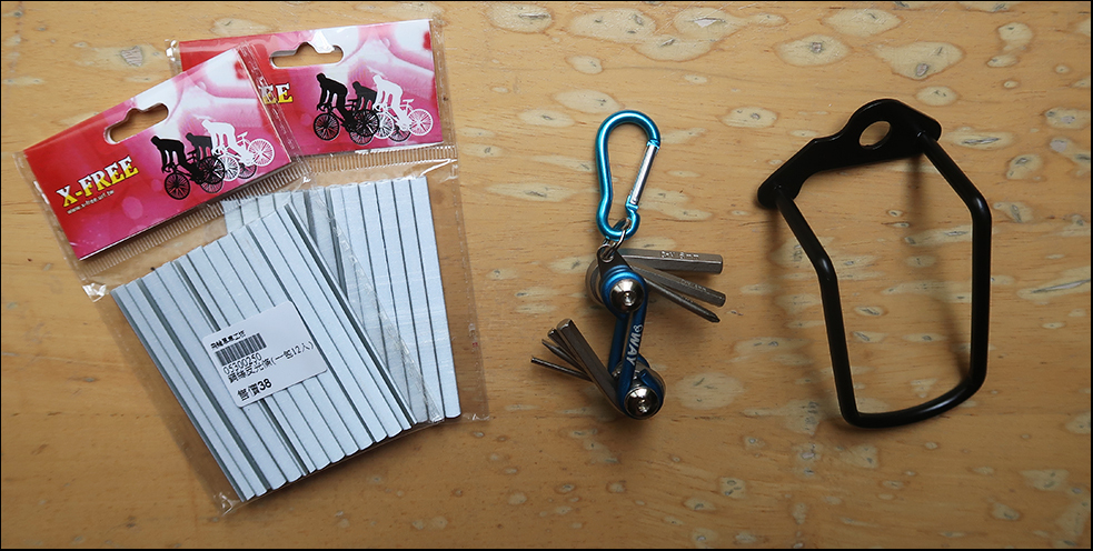 It was a nice surprise to find a rack with those old-school derailleur guards, because I looked for one of these over six months ago to no avail. Only NT$18- about 60 US cents - I considered it an absolute no-brainer, as my commuter bike sometimes gets knocked over while parked outside and the bolt-on gear-hanger can get bent. This has happened a couple of times and has ended up costing me a bit to fix... just a new gear-hanger is around 20 times the price of this metal guard.
