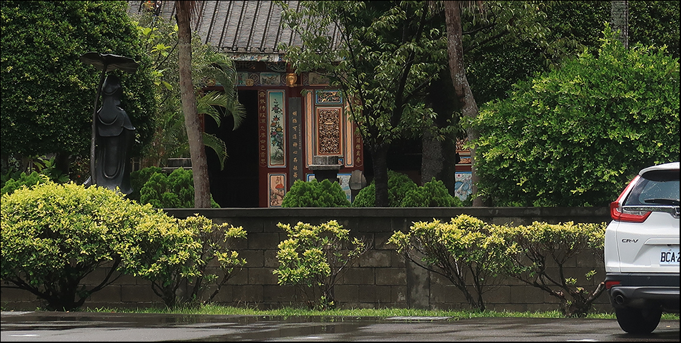 The alley T's into the bending road that drops down into the Dahan Valley and as I'm descending among the trees, it begins to rain yet again so I brake at what looks to be a small temple, but after squeezing past a barrier made to block scooters, it's clearly an extravagant shrine. There's just enough overhang on the ornate roof to keep the rain off, but this damp little spot, permanently sheltered from the sun, is home to a lot of pesky mosquitoes and five minutes later I'm back on the bike, freewheeling down the hillside.