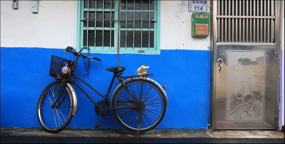 A long, narrow lane lined with small, simple homes at its far end takes me towards the hill. A bunch of these old houses have been painted the same - blue and white - and it's likely that everyone here knows everyone... a couple of women stand in the middle of the tarmac having a chat; a man on a old-school motorcycle pulls up to deliver a bag of food to someone he clearly knows; a sit-up-and-beg bicycle with antiquated rod-actuated brakes is parked outside one place and the noise of people talking inside is audible as I cruise past.