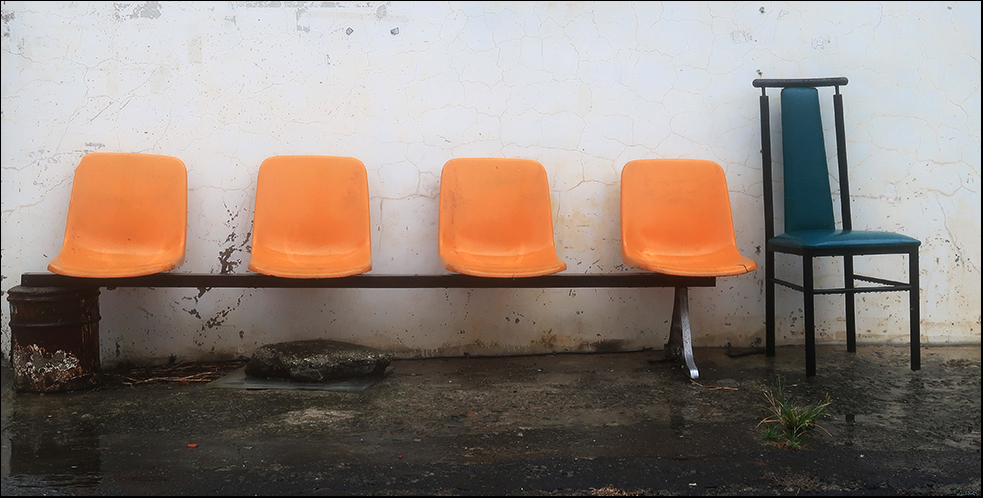 A few minutes later he offers me a new PVC rain coat, but I show him my cape. He likely is wondering about my sanity, especially when I take a snap of four nearby plastic chairs that have been mounted onto a steel rail before getting back on my bike and cycling off. It's barely drizzling and it soon peters out