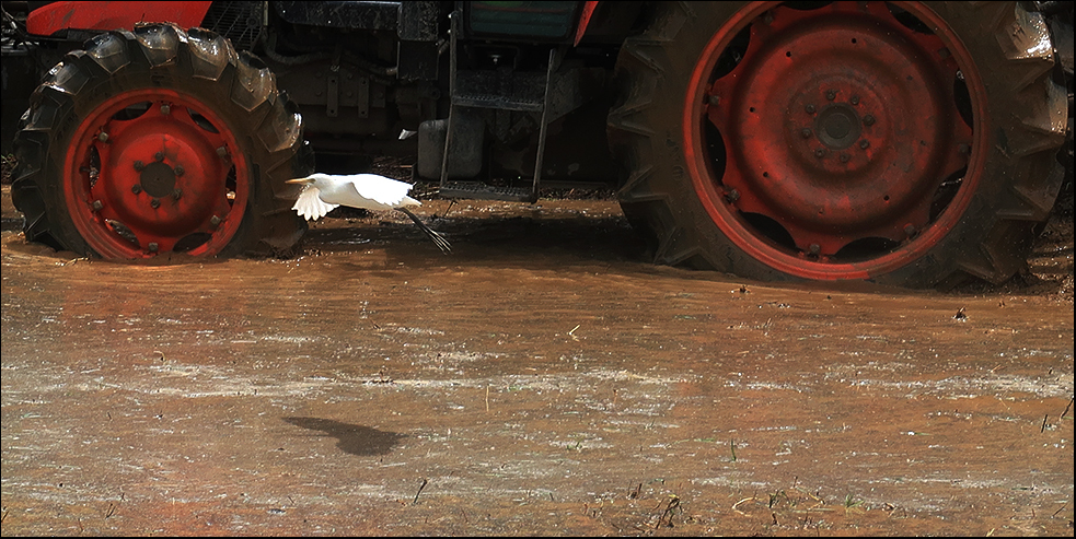 A farmer is tilling a small field and egrets are scavenging whatever it is that the tractor is churning up. There's about 20 of the long-legged birds loitering around as the tractor chugs along in the shallow water, which will probably have rows of small rice plants dotted among it within the next day or two.