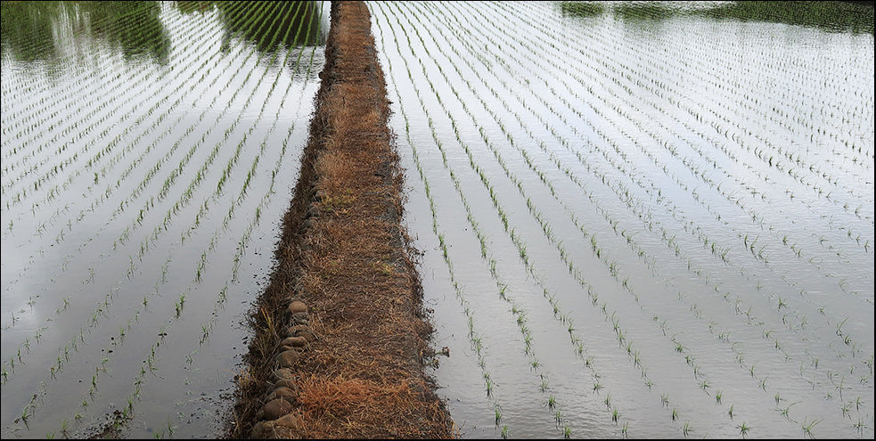 After just a few kilometres a twisting back lane drops me down an escarpment and it's open countryside at the bottom, with paddies just having been planted with three-inch shoots. Another lane then takes me around them, but within a minute drops are falling again and the only place around to hide is a single-storey farm house.
