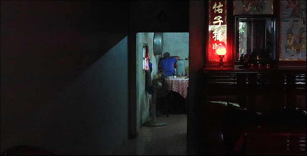 The room is dominated by a wooden shrine taller then me that's to a deceased family member. It could well be for her husband. She looks to be 70 years old. There's also an office desk against another wall and I can see through a door to the back where the kitchen is, while what I guess is the living room is just through a small vestibule. Apart from the shrine, it's all very simple without any trace of superficial decoration. A clock above the desk tells me it's 11 o'clock already.