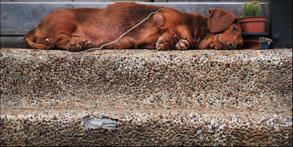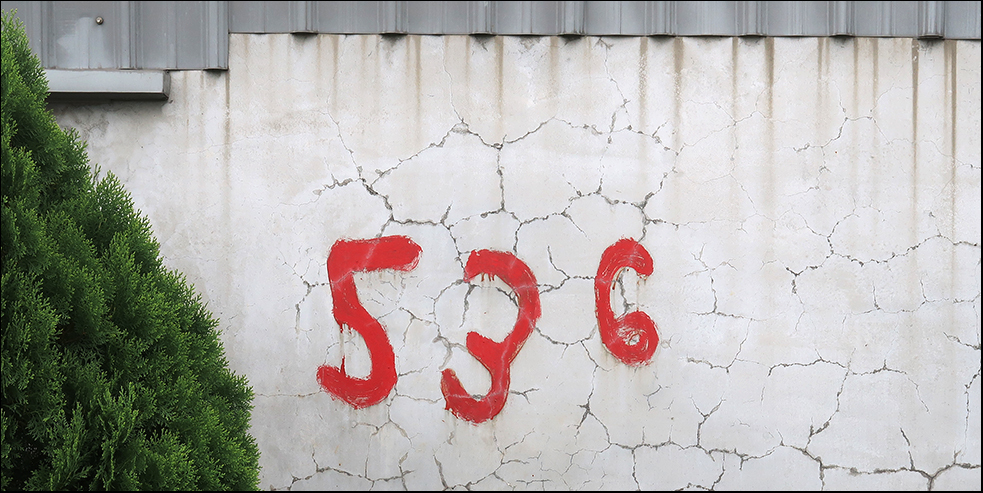 Once on the main road I stop to take a snap of a rendered wall of a house that has its number 536 daubed on it in bright red paint. It looks like a child's handiwork, done with a too big a brush, but it's so bad it's good. While I'm doing this I can see a house nearby has a plump sausage dog prostrate on the front step and it doesn't stir when I go over and stand in front of it and take its photo.