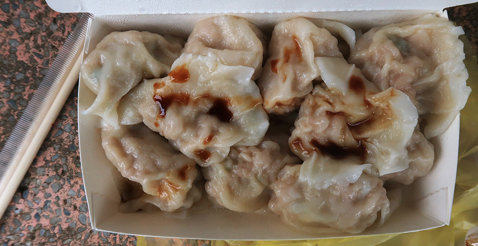It's surprising that the place still doesn't offer indoor dining as Covid restrictions have been eased, but it's takeaway only and my 10 dumplings get packed in a small card box and the man pours some soya sauce into a tiny poly' bag and I get some bamboo chopsticks and ride off with the box in a plastic bag hanging off my bars. Hopefully there's a spot to sit down not too far away.