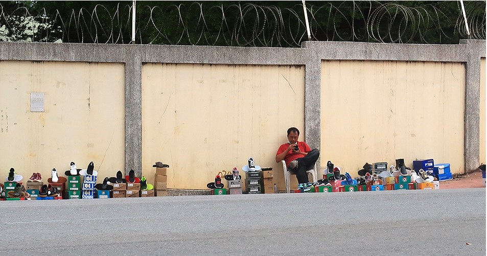 At the end of the road there's a guy sat with his back against the high wall of a military base with an assortment of shoes stacked up, but experience tells me there's no chance of him having anything in my size. I take American 13s and he'll be selling cheap, Chinese-made pairs.