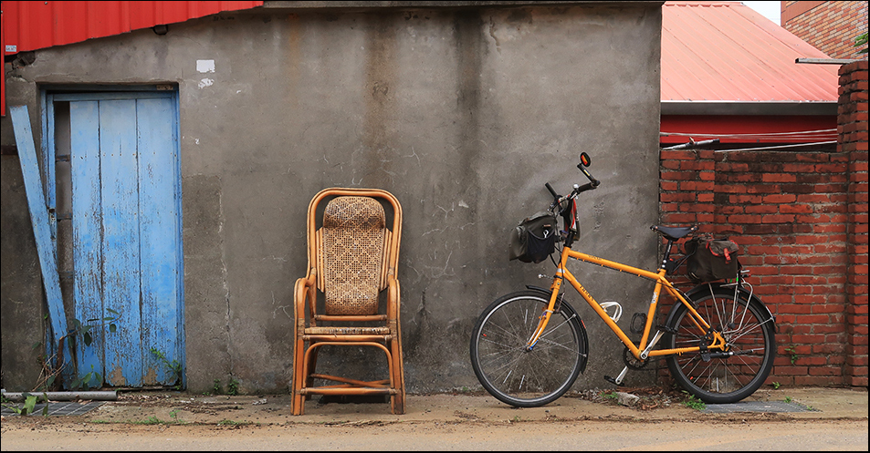 About ten minutes ago I saw a wooden stool that I took a snap of (above) and on a small lane pretty close to Longtan, one that acts as a shortcut, I spot a wicker/bamboo chair that someone likely sits in occasionally to sun themselves and I stop as there will be few other photo opportunities. My bike gets in on the act...