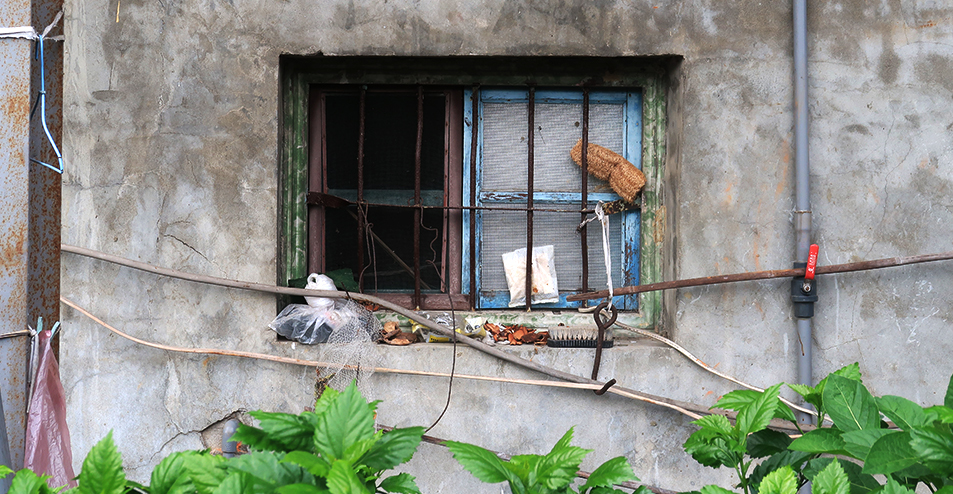 We get back on the bike path and follow it to get into the center of town and plan to get a coffee, but I stop after 100 metres as a small window on an old house looks interesting, with a tiny loofah wedged behind one of the rusting metal security bars.