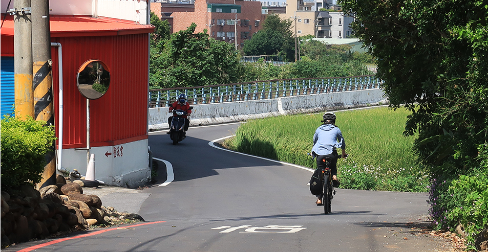 There's rice growing to our right, spaced between houses and farm buildings, that looks as though it'll get harvested pretty soon. Across the narrow river it's mostly new-ish homes and apartment blocks.