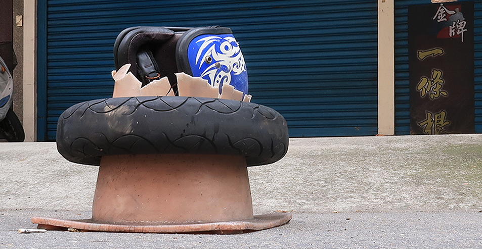 There's a traffic cone on the way that I stop and take a snap of for my Canadian friend g, who currently has a thing for them. This specimen has been badly smashed and there's a motorcycle helmet wedged into the open top of the stump, which has a scooter tyre placed on it. A man across the street looks confused as I bend down and take a photo. He must be wondering what it's all about.