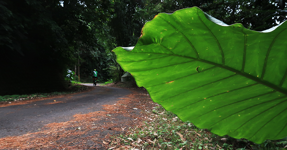 The view is consistent: large leaves and ferns and dense foliage line the lane, but at some spots there's a small gap and there's a glimpse of the surrounding slopes. It's quite a jungle.