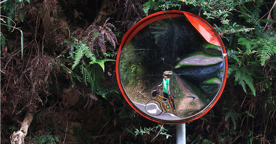 It's a while since I rode this way and I think the last time was with Ralph, g and Debbie. We posed for a photo at the top and when I get there I make do with one of me reflected in a convex mirror where a farm track branches off. A vehicle has knocked the thing and consequently the image is distorted, but that's what attracted me.