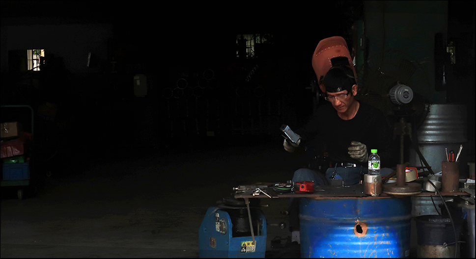 Five minutes later, a truck parked outside a workshop has lots of shiny steel discs about 20cm in diameter arranged on sheet covering the back. It's a strange sight and looks like what you'd do if you wanted to dry something wet, like vegetables. The guy inside the large shed notices me and smiles and after I take a shot of the discs, it seems he'll be happy enough to let me take his photo while he uses some cutting gear. He is.