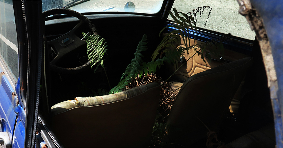 A bit further up the road a fern is enjoying a bit of sunshine between the front seats of a clapped out Mini that's sitting near the edge of the road outside a ramshackle car repair place. Where it gets water from is a mystery. The rear broken window allows me to get a clear snap of it.