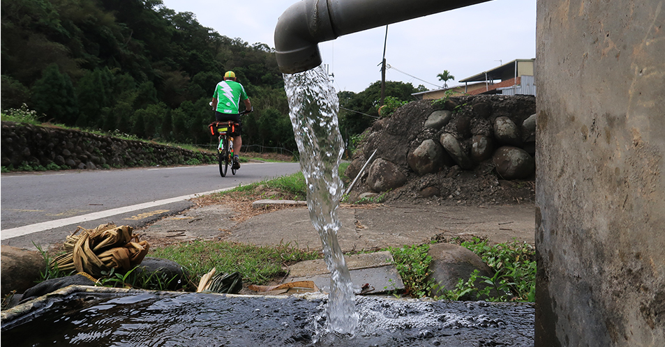 Water is gushing from a 50 mm plastic pipe into a shallow, rectangular concrete container outside one house and I decide to set up the tripod and capture myself riding by. It's a bit awkward because there's a deep gully next to it, but after adjusting the legs the view on the screen seems about right and I set the camera's programmable timer to take three shots after 15 seconds and press the shutter release, but then notice a man has appeared from out of nowhere and is now facing the camera.