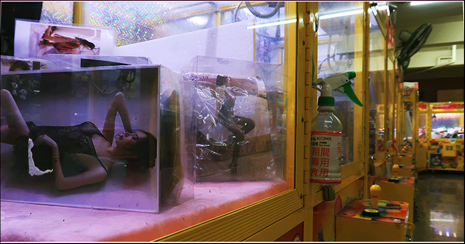 Inside it I see the contents close up and about half of the machines are filled with boxes that have sexy looking women on them. I imagine local young men who are too shy or embarrassed to buy whatever it is inside from a brick-and-mortar store will come here to try to claw up a box with some degree of anonymity. The place is empty and it feels a bit sad.