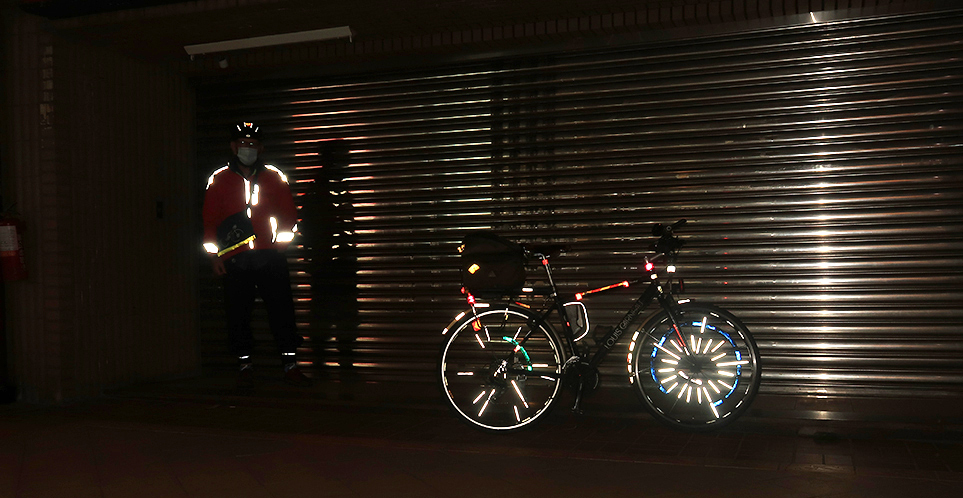 You can see my bike (below) is covered in tape to make it more visible at night. There are two front LEDs and two on the back -one of them attached to my helmet, which also has some reflective tape stuck to it. As long as motorists are not fiddling with their smartphones, I reason they're bound to notice me riding along the road.