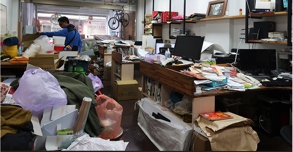 The ginger cat is still there curled up in a cardboard box on the guy's desk. It's oblivious to all the disarray, with a nearby desk hidden under a pile of paperwork and whatever. Mother is at another desk, using a computer, and the top of her head is just visible among the stacks of stuff while another customer is like me, not sure what to do with himself. I notice a mountain bike hanging up outside.