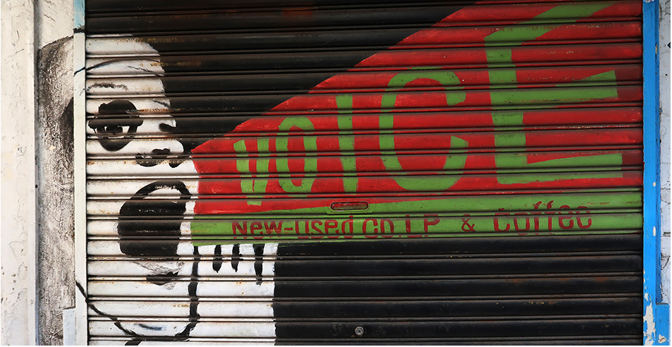 I ride straight along the busy road towards town for a few minutes, heading to the back of the train station, and make a left near the charity shop and park my bike outside the printers.