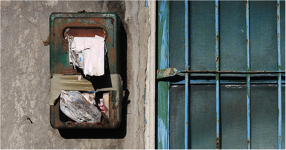 There's an old post box on a derelict single-floor house that is now in the sun, so I take a snap of it. It's a metal one. They're made of plastic now.