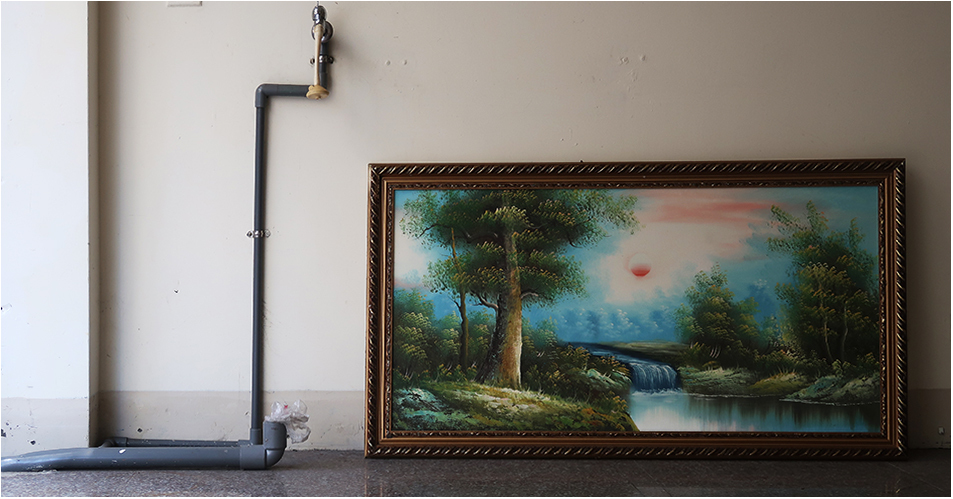 I head to the 114 just a block away, but before the junction there's an empty unit with the roller door up and there's a painting leaning against a bare wall. It seems like someone is in the process of moving out. It's a piece of kitsch, the type of painting that is made in a production line and sold cheaply. I pop into the empty space and take a quick snap and get back on the bike.