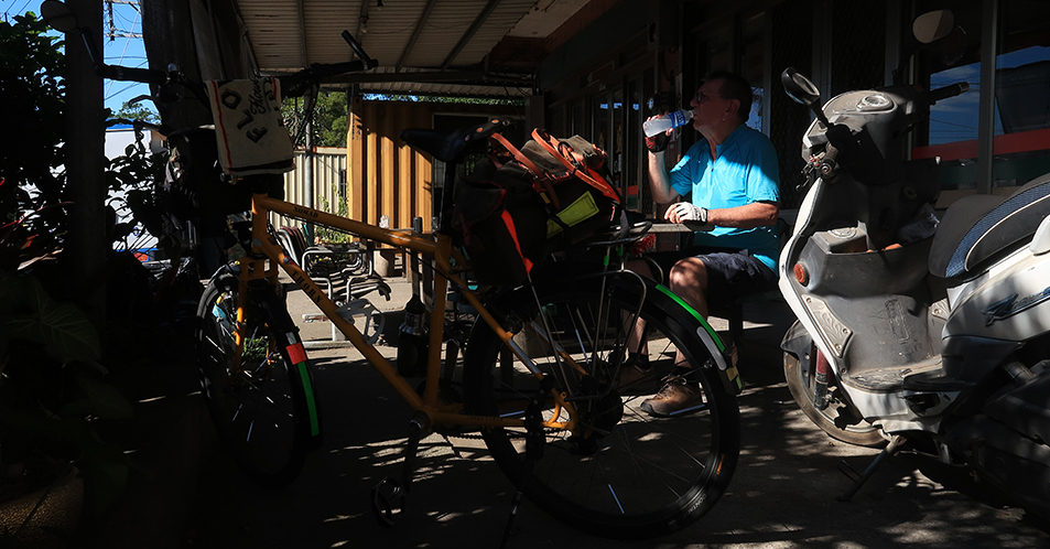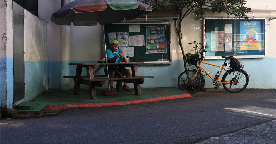At the bottom near a junction is another shop. This one is beside a temple and there's a wooden table outside and I get an orange and a bottle of water which cost NT$10 each - 30 US cents - and it's nice to enjoy a few minutes sat down. The heat is getting to me.