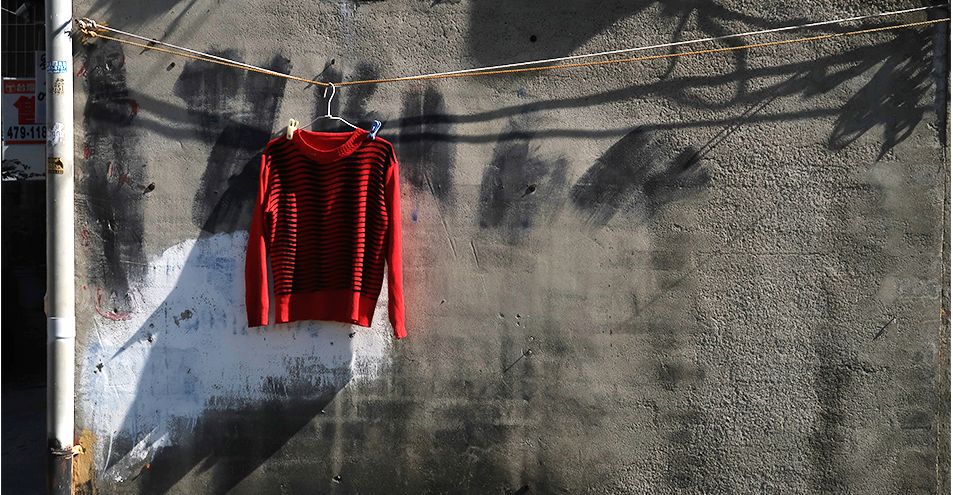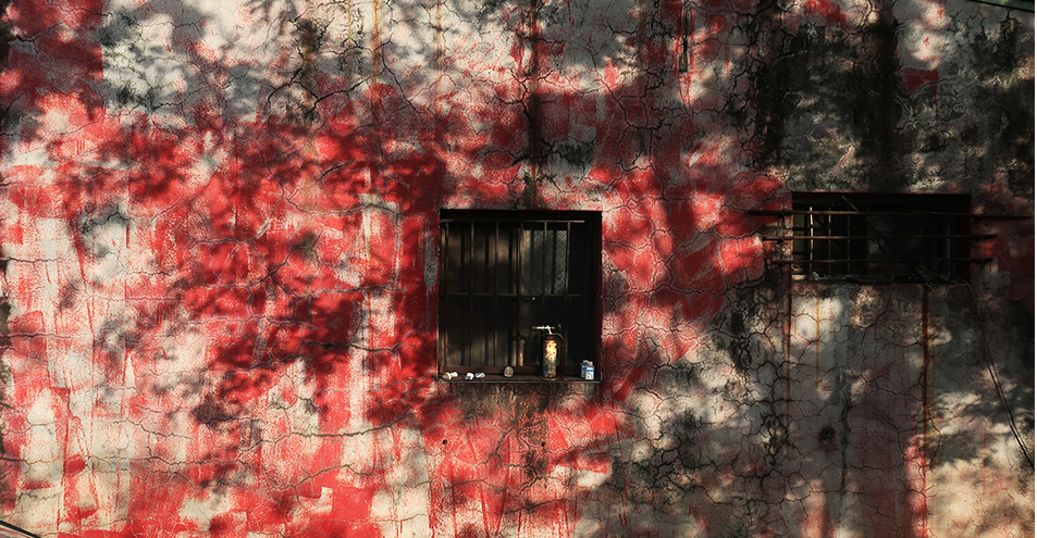 A wall of a building that seems like it is or was a car repair shop is in dappled sunshine and the odd paintwork looks nice, with blotched red on top of white. A chained-up dog goes a slightly mental when I walk up and take a photo, which brings the owner out to take to see what's happening. He takes a quick look at me and goes back inside without saying a word.