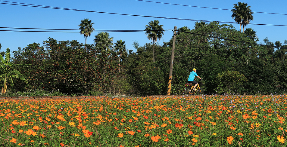 Ten minutes later, my progress is decent and it seems it won't be long before I'm sat in Louisa with a cappuccino, but there are pretty fields awash with blooms and I take a self-timed shot which takes a few minutes as I have to place the tripod in a field and trek back and get on my bike. It takes two attempts to get myself in the right place when the shutter clicks.
