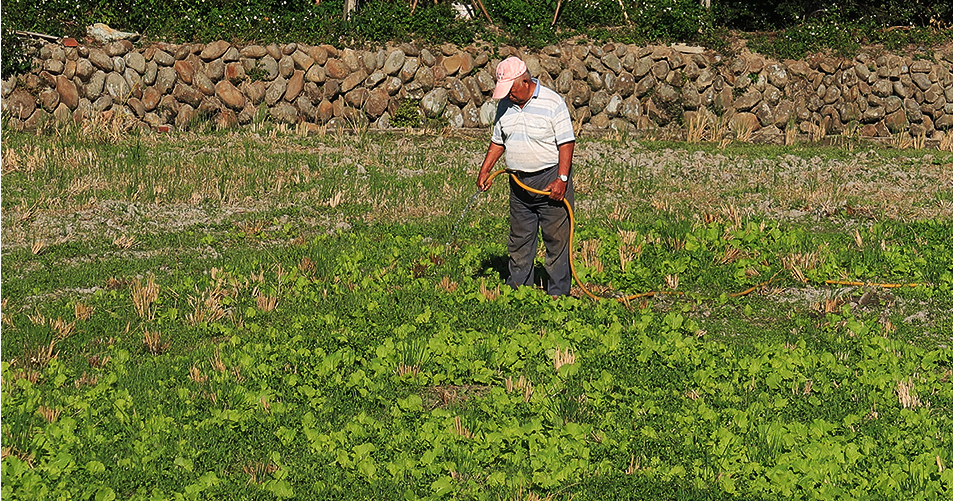 One farmer is watering a field the size of a basketball court with a domestic hose. It's hard to say how long it'll take him.